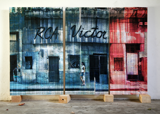 HABANA RCA VICTOR (2014) Bubble Ink, Pages of Directorio Telefonico Cuba, Collage upon Popular plywood, three parts, ca.155 x 100 cm. Studio Image