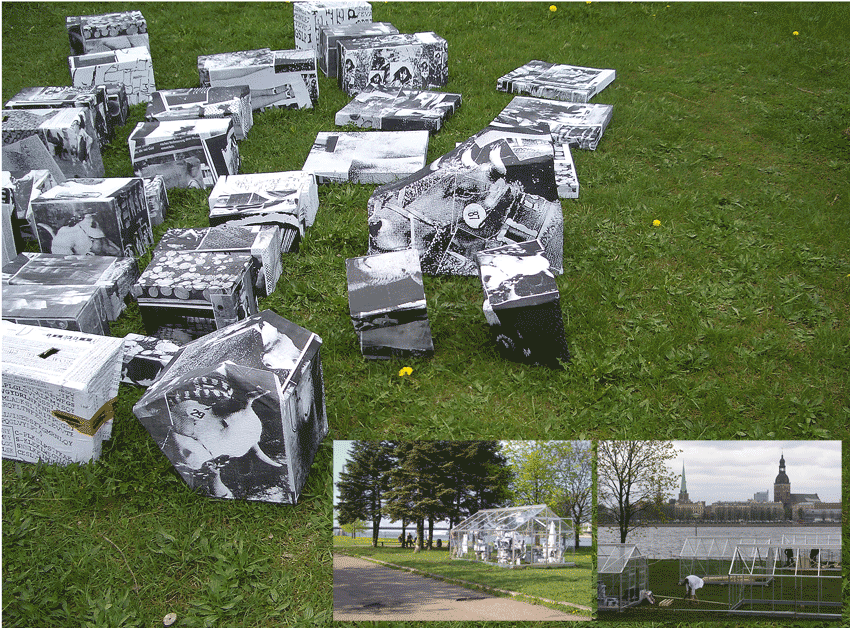 Paper boxes covered by xerox of collected found footage material about biotechnologie and cloning of plants and animals, wood, fixing materials, growing plants, illuminated greenhouse.Nine greenhouses were provided by NOASS to 4 Latvian and 5 German artist/groups for installations, experiments, illuminations...).
