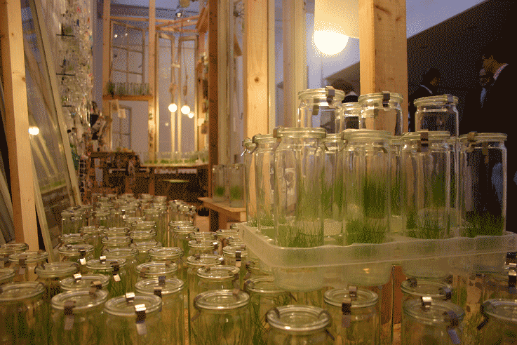 Laboratorium/Wintergarten. Verschiedene Materialien, temporäre Installation mit Wachstumsprozeßen, 600 x 250 x 450 cm (flexibel). Besitz des Künstlers, Courtesy Galerie Brigitte Schenk, Köln. Lebende Pflanzkulturen, hier Halme des Wiesengrases Poa pratensis (L.) wachsen auf künstlichem Nährmedium in sterilen Einweck-Gläsern. Mit freundlicher Unterstützung des Fraunhofer Institut IME Aachen/Schmallenberg (siehe Das gläserne Genlaboratorium ) Weitere Bilder - |