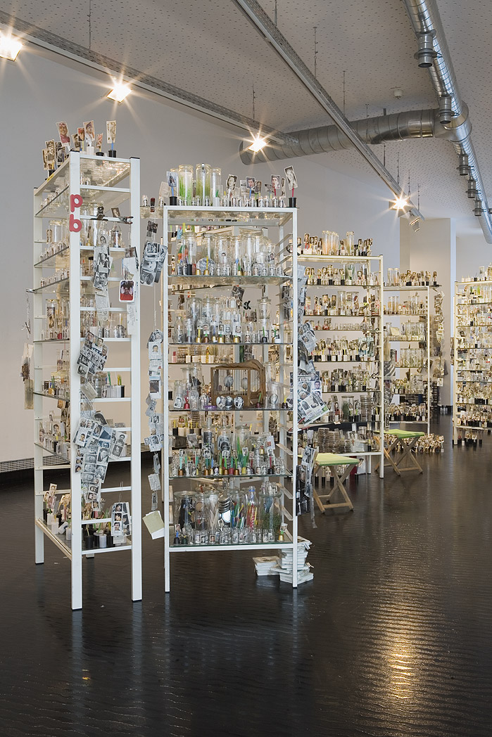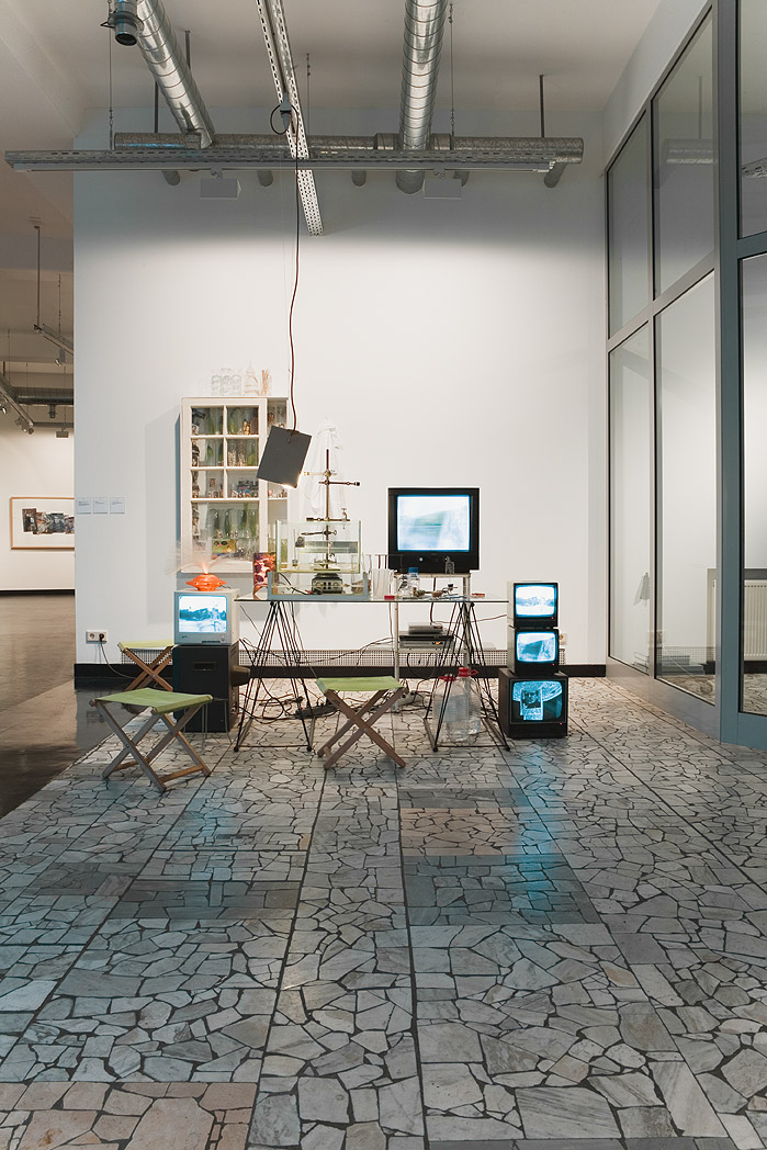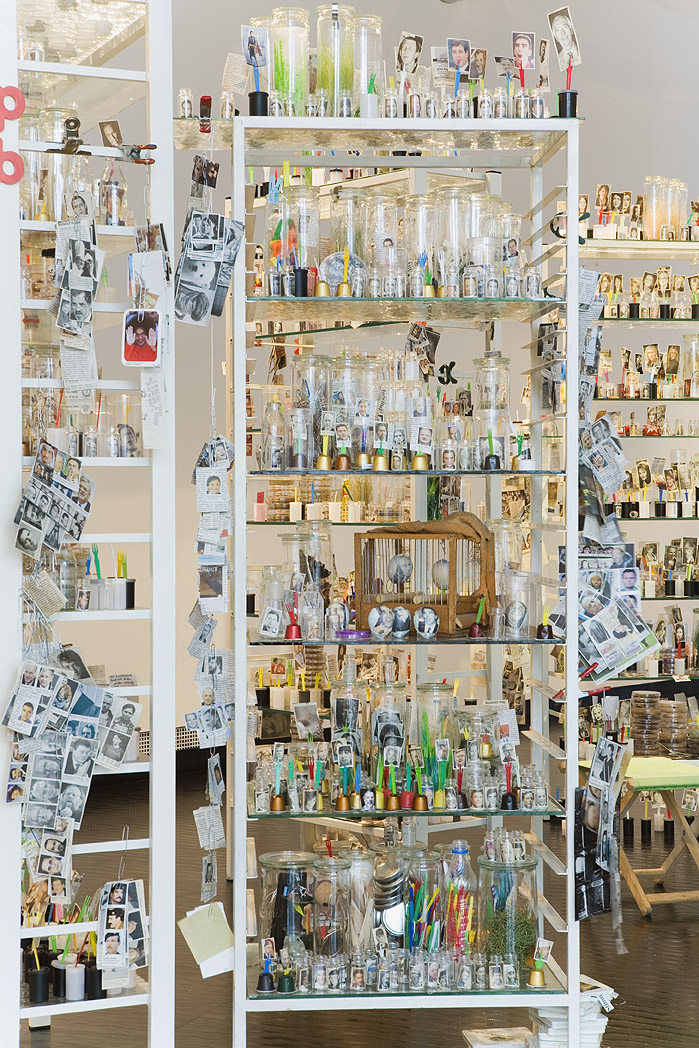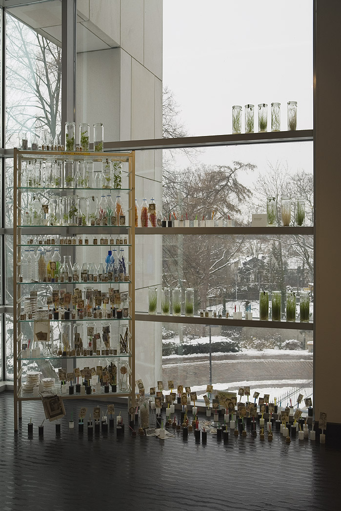 Rudel von Laborregalen, Pflanzenkulturen in Einweckgläsern, Glaswaren, Zeitungsauschnitte, Artefakte, Klappstühle. Foto: Tamara Lorenz für KF (2010)