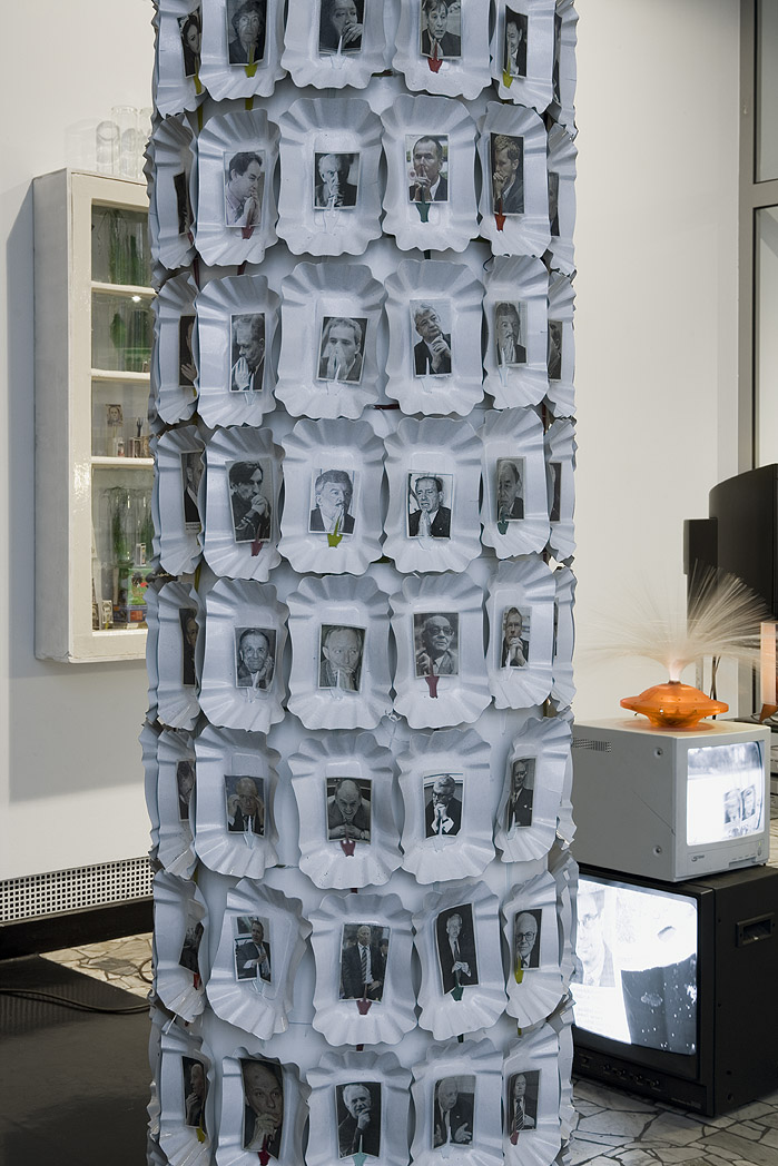 Umwickelte Säule, Einwegteller, Plastikgabeln, Zeitungsauschnitte (Einspalter: Links-Rechts und Beidhänder var.) Foto: Tamara Lorenz für KF (2010)