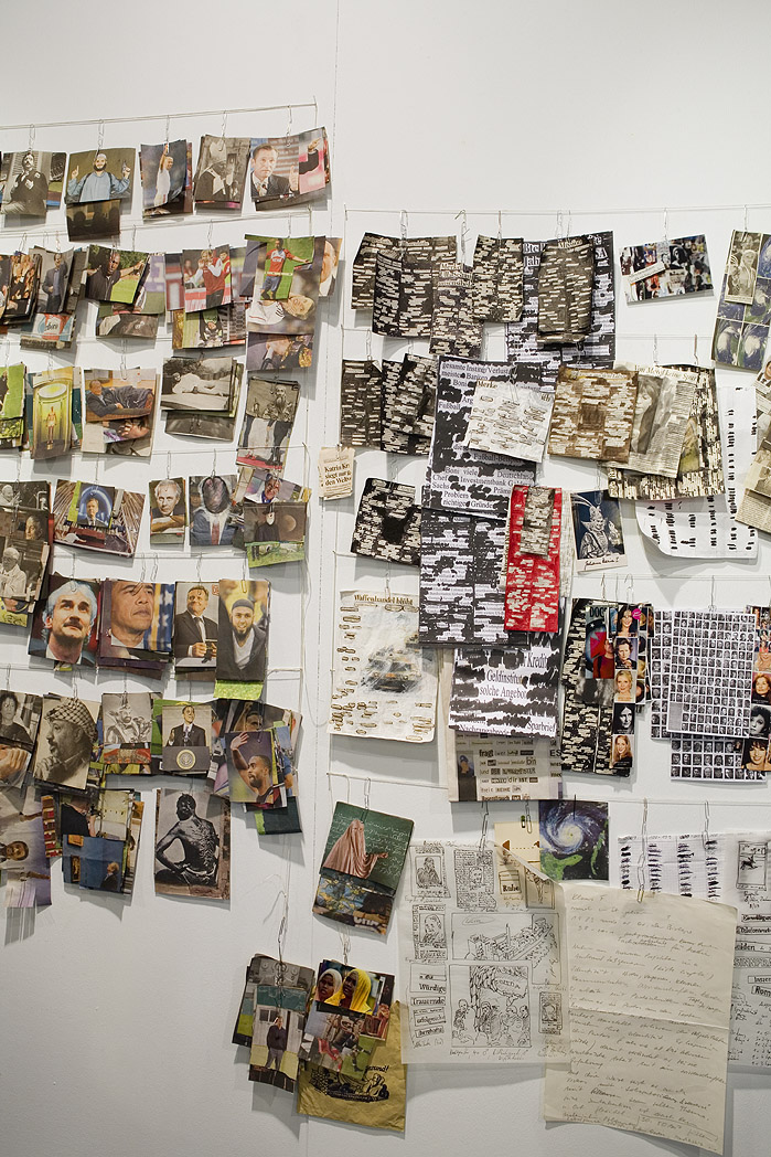 Wand mit sortierten Zeitungsauschnitten, Skizzen, Collagen. Foto: Tamara Lorenz für KF (2010)