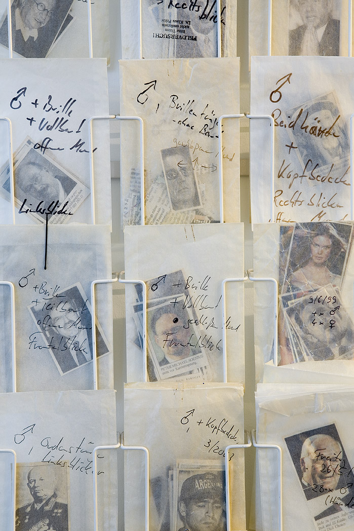 Pergamintüten mit sortierten Zeitungsauschnitten, Postkartendisplay. Foto: Tamara Lorenz für KF (2010)