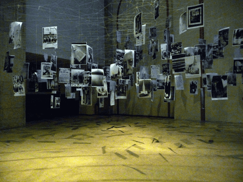 Auf der Suche nach Pfarrer Carl Jatho in der Christuskirche, Köln. Installation, variable Größe Faden Büroklammern, Xerox, Fotografie. Von einem durch die Kirche gespannten Netz hängen an vielen Knotenpunkten Fäden herab, an denen mittels Büroklammern doppelseitig bedruckte Fotokopien herabhängen.