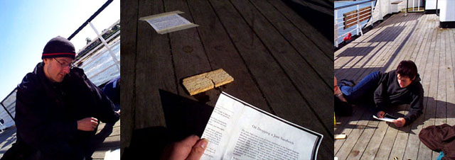 On Dropping a Jam Sandwich - loop reading on the upper deck In Arnhem we go on land to search in the public library for more material. In an encyclopedia on tales of the sea we find the text for our second reading performance. real audio recording