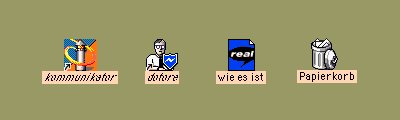Nun wenn ein Diskurs über Bilder geführt werden soll, muss die Sprache instrumentalisiert werden, zum Erkennen des Wortes bzw. Satzes als typografisches Bild. Schreibt man mit Hilfe eines Computers, begiebt man sich schon in die diffuse Text+Bild-Welt: das Interface wird bestimmt von Icons. Der Nutzen von solchen Icons liegt nicht nur darin, Platz auf dem Bildschirm zu sparen - vielmehr stellen die Wortbilder das CI eines Programmes und dessen Philosophie dar. |
