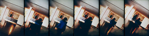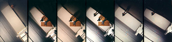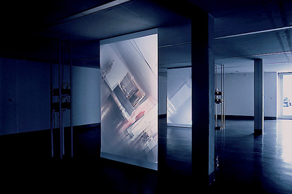 4 Slide projectors with fade device,1Impulstonband,2semi-transparent screens(160x260cm) The work consists of 400 slides,which were taken of my allocated exhibition Space over a period of one week during the previous exhibition and its dismantling. Taken from opposite sides of the space, the slides were projected onto two semi-transparent screens placed diagonally opposite each other in the middle of the room. The projected images of the space were consecutively blended in and out over one another,and each image was rotated slightly through 360¡. The transition from a visited exihibition space to an empty space was an important aspect of the work. The gallery visitor was presented with past images of changes in the space that they are standing in. The images they see reflect the situation that they find themselves in - a specific moment in time which continuously repeats itself. |