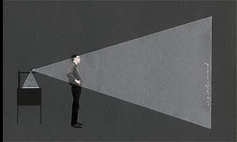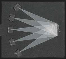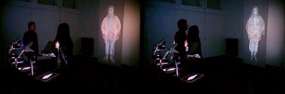 Single images of people are projected onto a screen on top of each other. Different combined images are created as the viewers move through the space and their bodies block one or more of the projections ![]() Darkroominstallation; 5 overhead projectors, 120x250 cm Transparentpaper |