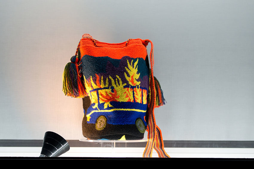 Camilo Sandoval plädiert in seinem künstlerischen Ansatz für eine animistische Perspektive, die die Koexistenz und Symbiose von Mensch und Maschine anerkennt. Seine Abschlussarbeit umfasst verschiedene Werke, die in individuellen wie kollektiven Geschichten auf die aktuelle gesellschaftliche und politische Situation Kolumbiens Bezug nehmen: ein Arcade-Spiel als Karikatur des politischen und sozialen Panoramas, Ponchos in vermeintlich idyllisch-floraler Camouflage-Optik, Hemden mit tropikalischer Barockornamentik generiert aus historischen Daten oder handgearbeitete „Mochila“-Umhängebeutel in leuchtenden Farben mit narrativen und abstrahierten Webmustern, die auf Schilderungen von Opfern des bewaffneten Konflikt zurückgehen. Sandovals LED-Panels „Banderas Alternativas para Colombia“ fügen den zahlreichen Entstehungsmythen über die kolumbianische Nationalflagge – Gelb für die Bodenschätze, Blau wie die beiden Ozeane und Rot für das vergossene Blut im Kampf um die Unabhängigkeit – weitere aktuelle Lesarten und damit potentielle Entwicklungen des Landes hinzu.
