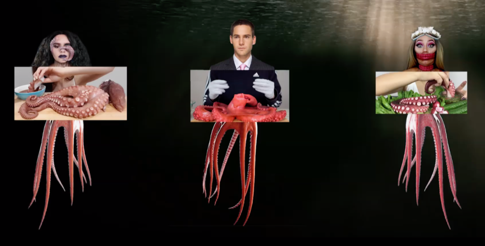 The ways octopuses feature in how we make them into culinary delicacies are as horrendous, tasteless and objectifying as the jokes NEOZOON has their interspecies avatars recite. The jokes reveal the low regard we hold octopuses in, uncover the rawness with which we respond to their suffering, how numb we have become towards the objectification of others, occasion for little more than nasty laughter, how we numb ourselves against their suffering. Naturally it is women that are ridiculed among (and used to ridicule) octopuses and vice versa.