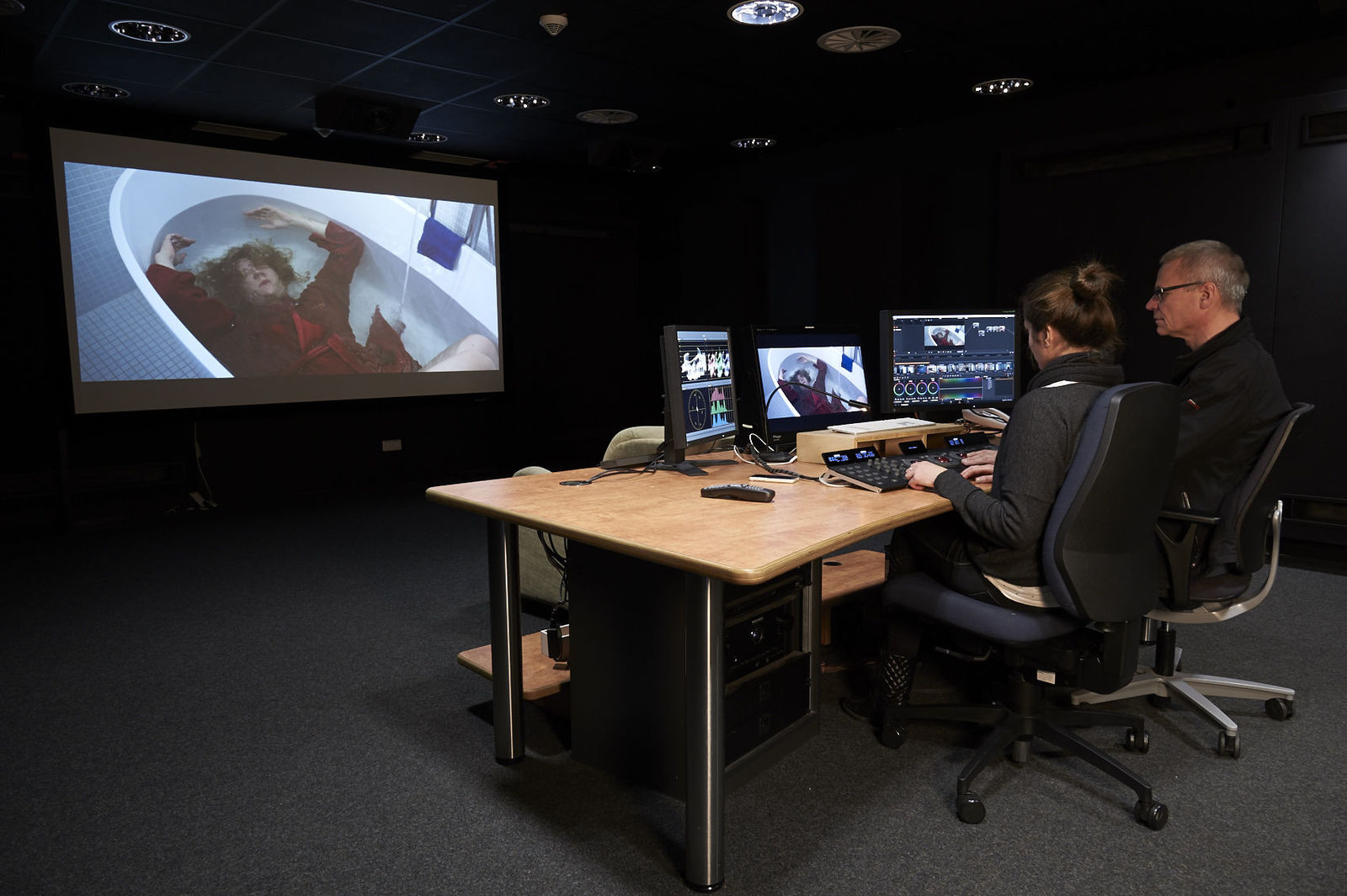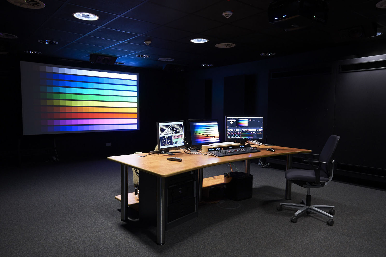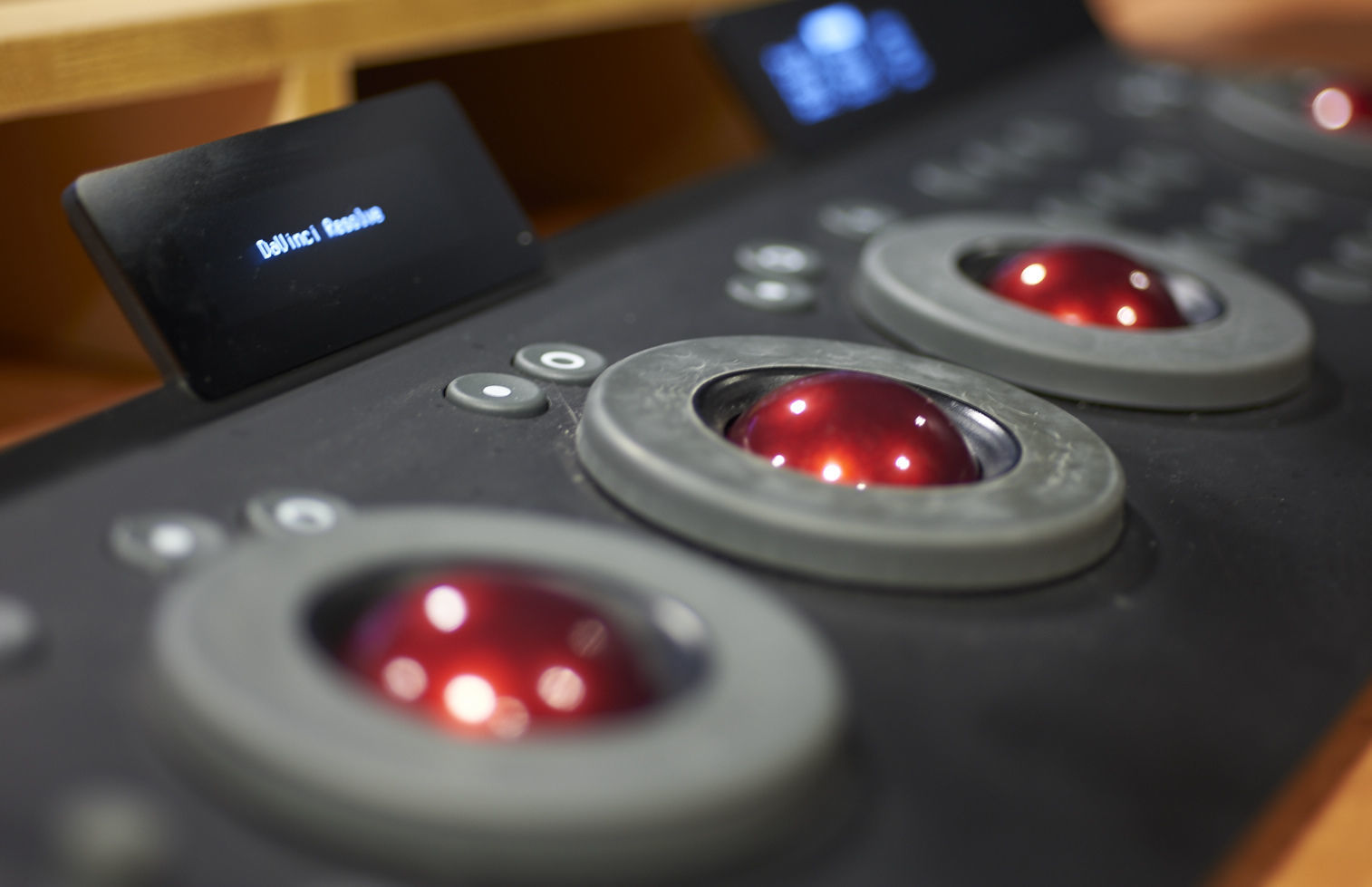 Color-Grading-Suite mit Projektion und Bedienpanel auf DaVinci Resolve Basis.