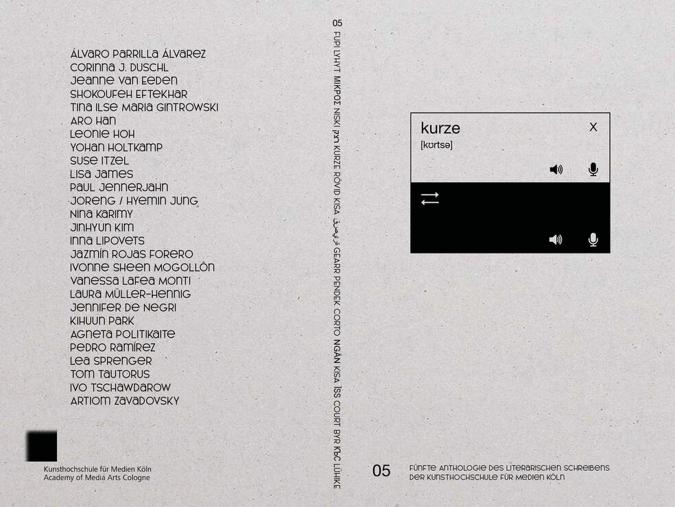 Die KURZE ist eine seit 2018 an der KHM erscheinende Anthologie des Literarischen Schreibens, die von wechselnden studentischen Redaktionsgruppen herausgegeben wird. Ihr Schwerpunkt liegt vor allem auf den Kurzformen: Gedichte, Kurzgeschichten und Essays. Zum KHM Open 2022 im Juli 2022 erscheint mit einem Fokus auf Mehrsprachigkeit die mittlerweile fünfte Ausgabe.KURZE #05Hrsg. von Yohan Holtkamp, Lea Sprenger, Jeanne van Eeden, Franca Pape, Tom Tautorus, Lisa James und Paul Jennerjahn. Köln: Verlag der Kunsthochschule für Medien Köln, 2022, 144 Seiten, 18,5 x 12 cm, Paperback.ISBN 978-3-942154-61-1Mit künstlerischen Beiträgen von Vanessa Monti, Jennifer de Negri, Laura Müller-Hennig, Tina Ilse Maria Gintrowski, Leonie Hoh, Corinna Duschl, Ivo Tschawdarow, Suse Itzel, Nina Karimy, Shokoufeh Eftekhar, Álvaro Parilla Álvarez, Aro Han, Inna Lipovets, Agneta Politikaite, Hyemin Jung, Artiom Zavadovsky, Ivonne Sheen Mogollón, Jazmin Rojas Forero, Jinhyun Kim, Kihuun Park, Pedro Ramírez, Yohan Holtkamp, Lea Sprenger, Jeanne van Eeden, Franca Pape, Tom Tautorus, Lisa James und Paul Jennerjahn.Kostenfreie Bestellungen ab Mitte Juli 2022 unter verlag@khm.de solange Vorrat reicht.