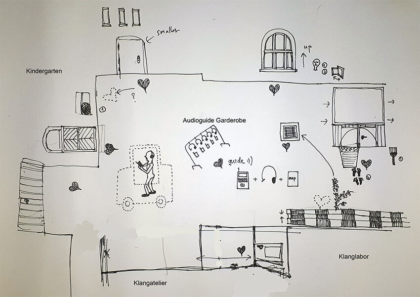 "Unsynced Parking Lot" offers the visitors an audio guide with a mono headphone and a map at the parking place in Filzengraben 8-10, in front of Klangatelier during the KHM Rundgang 2022. Through this audio guide, the visitors can create an individual acoustic state in each situation by pressing the buttons on the audio player and exploring the space through the recorded and drawn information.