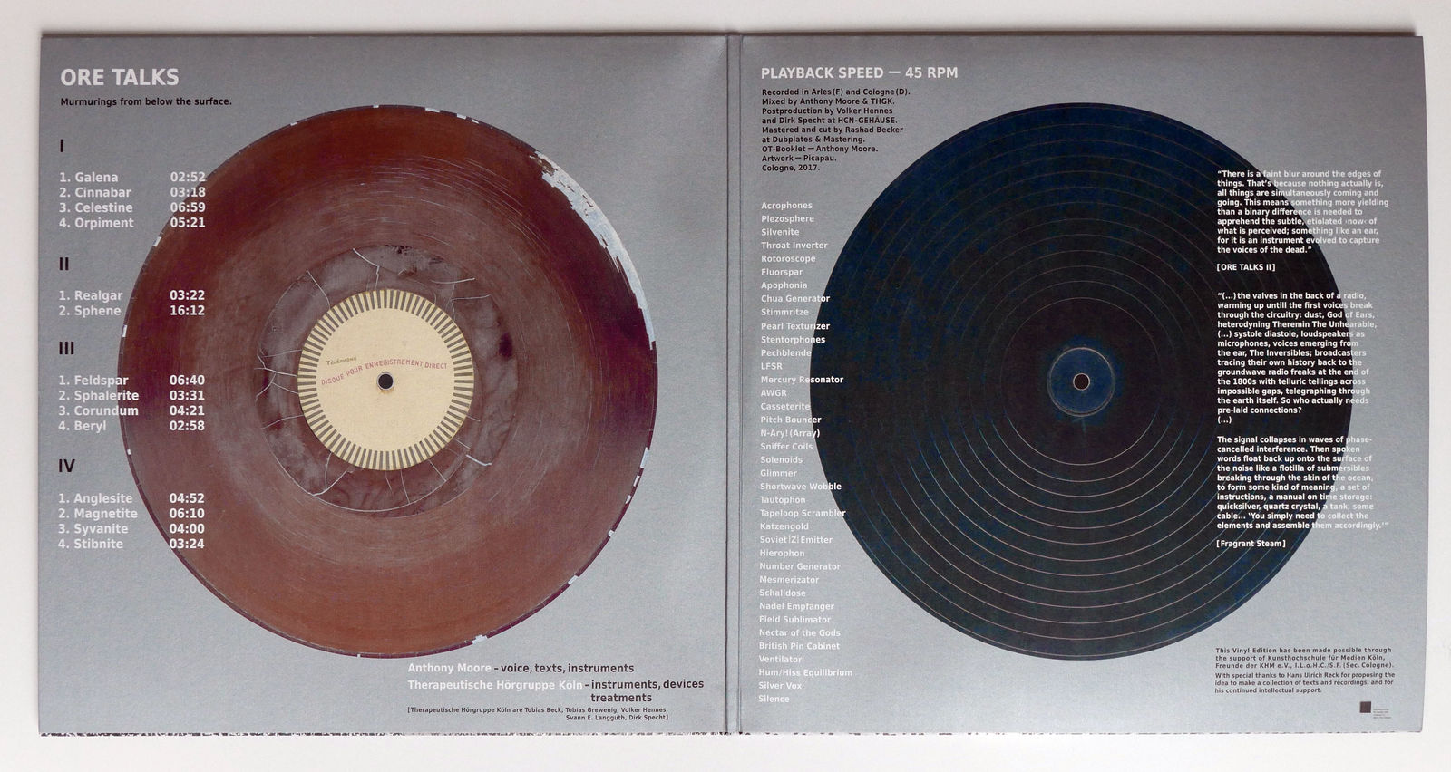 Murmurings from below the surface: the call of buried things that seek to be disinterred. Anthropomorphism notwithstanding, there is something to be said for giving a voice to inanimate minerals. After all, their constituent elements come from the stars and have also given rise to us humans. Furthermore, when those same elements are alchemically transformed into compounds of metal and fillers of plastics, of quicksilver and piezo crystals, of the very air, water or copper that play host to sound in its various forms, transporting speech, then ORE TALKS emerges as a title with some resonance.
