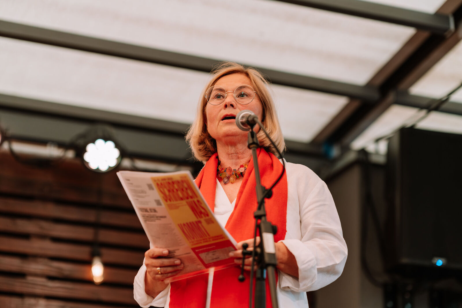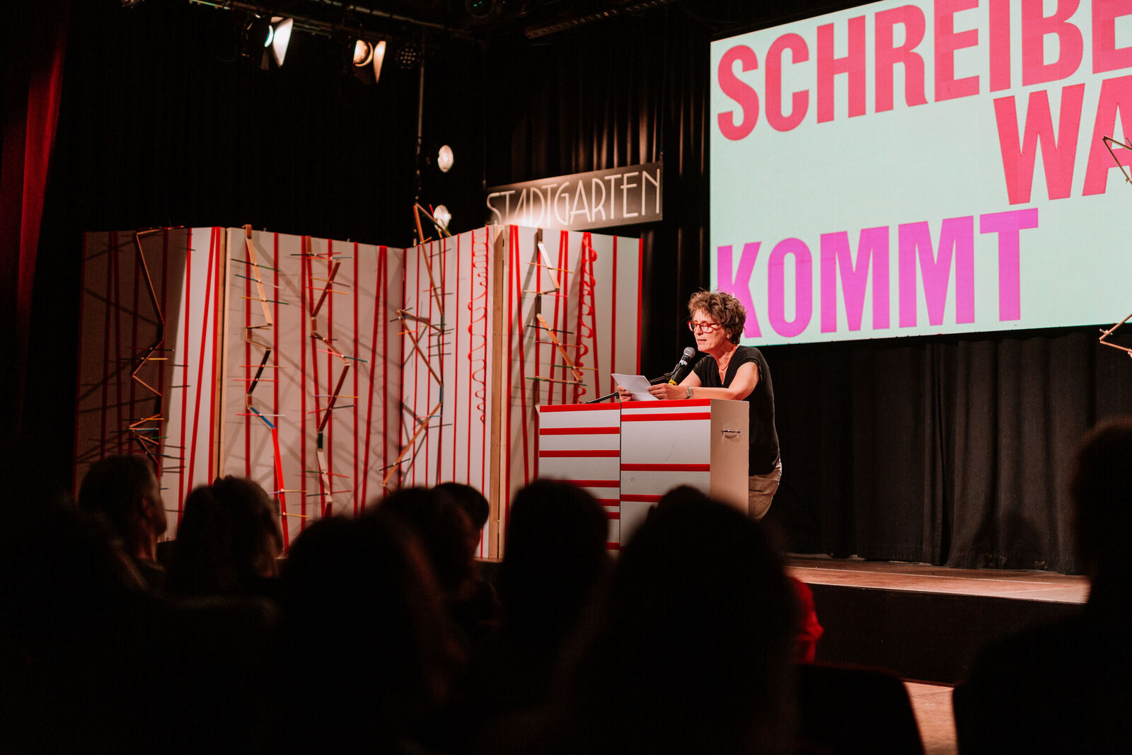 Grußworte von Kathrin Röggla (Kunsthochschule für Medien Köln), Ulrike Draesner (Deutsches Literaturinstitut Leipzig), Stefan Charles (Kulturdezernent der Stadt Köln) und Andrea Firmenich (Generalsekretärin der Kunststiftung NRW)