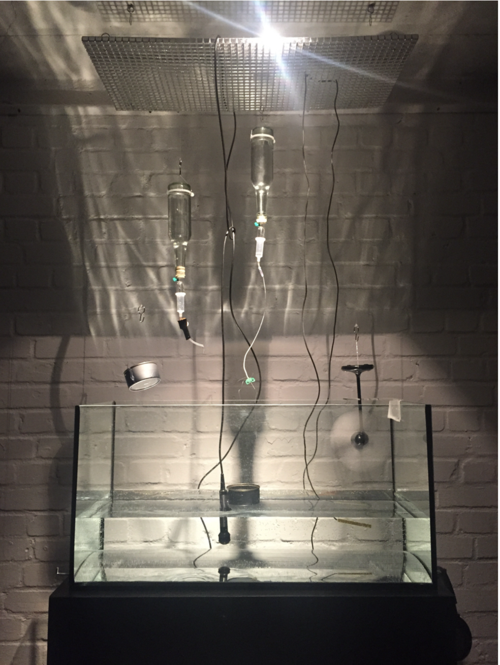 The basic construction of this work consists of an aquarium, a hydrophone, animated objects
