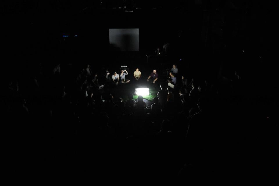 Zuschauer werden gebeten sich in einem Kreis rund um die Leuchtstoffröhren zu setzen, ähnlich wie