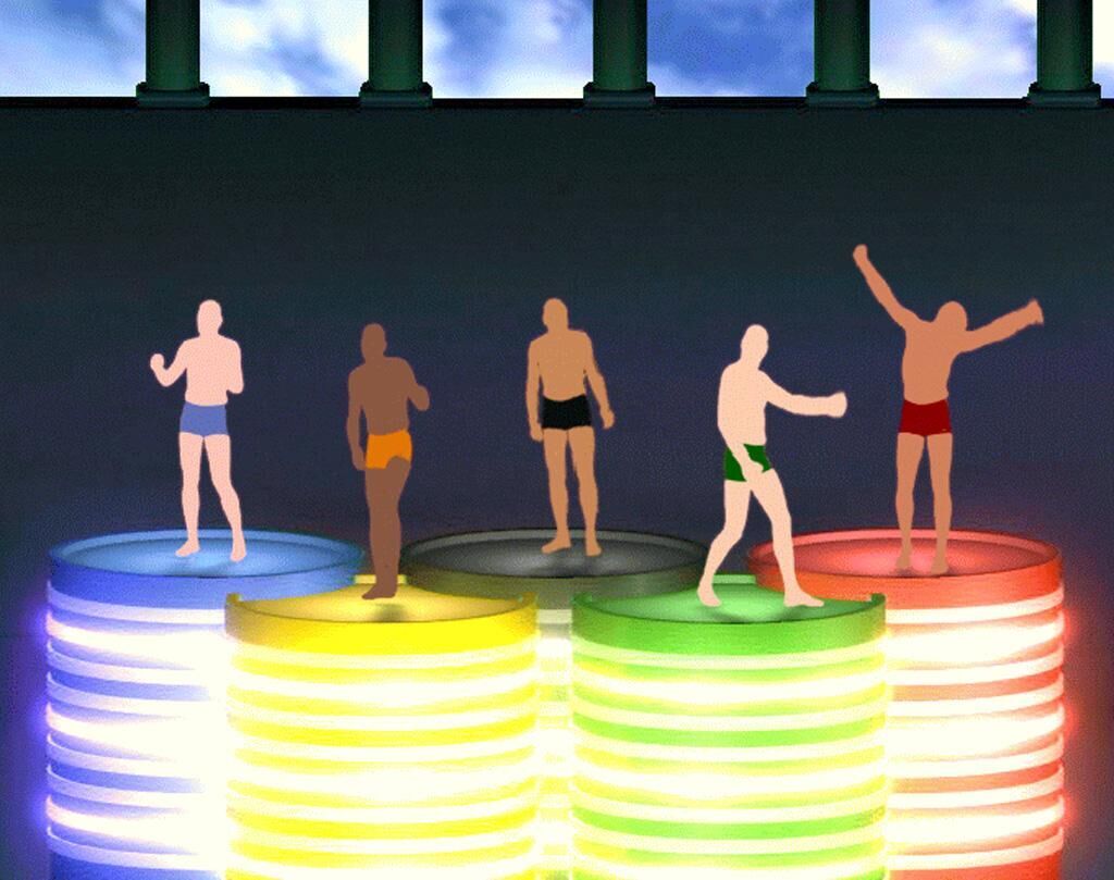 Ein Aerobic-Video. Fünf Personen agieren auf fünf blinkenden Säulen. Sie treten Olympia mit Füßen. Ein Flugzeug fliegt von links nach rechts. Verdunkelung. Ende.