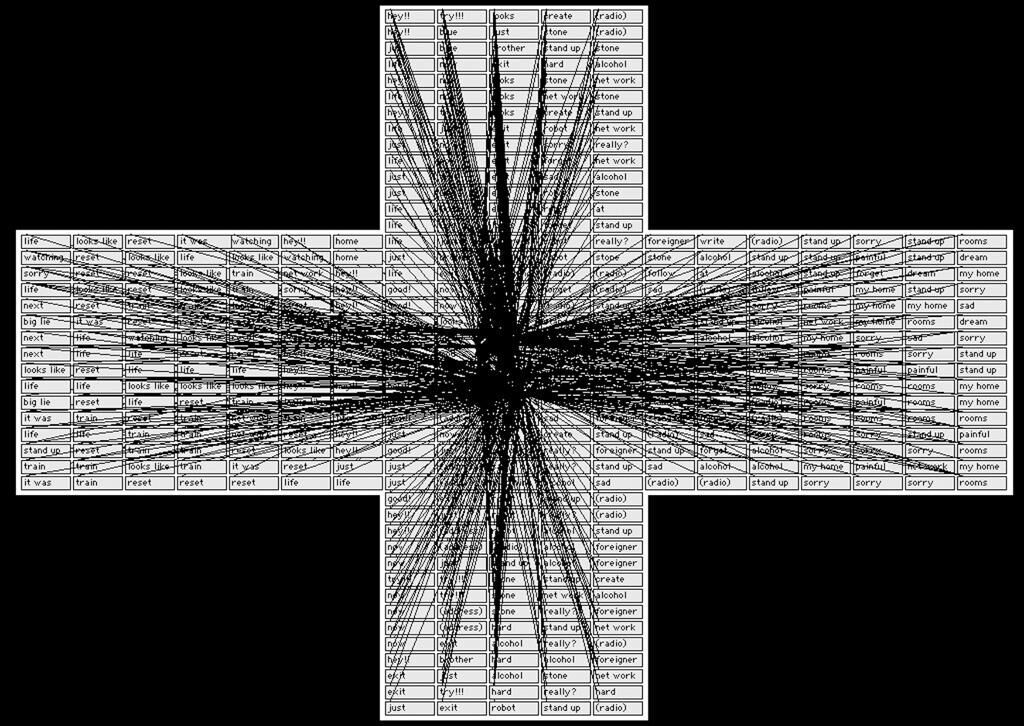 Die Arbeit geht von der Idee der Verwirrung (Syntax error, Synesis) beim Sprechen und Schreiben aus. Bevor man etwas spricht oder schreibt, existiert die Sprache im menschlichen Kopf zunächst nur fragmentarisch (nicht linear), erst danach wird richtig gesprochen oder geschrieben (linear). Wie bei Kaspar Hauser von Peter Handke, “Warum fliegen hier schwarze Insekten?” (Sprachlicher Kreislaufzustand). Ich programmierte, dass jedes einzelne von insgesamt 600 Wörtern oder zerstückelten Sätzen in einem zeitlichen Abstand von 10 msec. vom Computer in die Rahmen der 463 Message-Boxen, welche kreuzförmig angeordnet sind, geschrieben werden und über Lautsprecher durch Sprachsimulation hörbar sind. Der Vorgang geschieht endlos und in Echtzeit. Aufgrund der begrenzten Leistungsfähigkeit des Computers ist diese Aufgabe technisch unmöglich auszuführen. Was man schließlich sieht, ist nichts anderes als die Fehler des Computers, welcher durch die Überforderung selber verwirrt ist (Zufall, Notwendigkeit). Es geht mir um die Visualisierung von Metatext und Metasprache sprachlicher Prozesse.