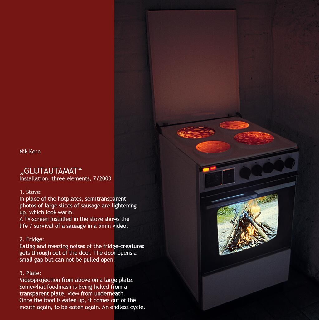 Anstelle der Kochplatten befindet sich am Herd ein Leuchtkasten mit Duratrans-Fotografien von großen Wurstscheiben, die warm aussehen. Ein im Ofenteil eingebauter TV-Monitor zeigt in einem 5-minütigen Video das (Über-)Leben eines Würstchens.