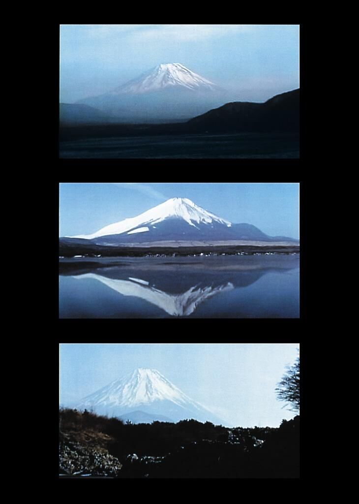 Das Video zeigt den Berg Fuji, aufgenommen mit einer Videokamera, die ich mit ausgestrecktem Arm auf den Berg gerichtet habe, solange es mir physisch möglich war. Der anfangs ruhige Bildausschnitt verwackelt zunehmend, der Berg gerät zeitweise aus dem Fokus, verschwimmt in Unschärfe. Die Sequenz endet in dem Moment, wo das Gewicht der Kamera nicht mehr gehalten werden kann. (Dauer: 9 Minuten) Der mittlere Bildschirm zeigt in statischer Kameraeinstellung den Berg vor einem See, auf dessen ruhiger Oberfläche er sich spiegelt. Nach und nach wird das gesamte Bild von lipueden Schwingungen erfasst. Ein Fischerboot fährt schließlich durchs Bild und zerstört die Spiegelung auf dem See. (Dauer: 90 Minuten) Der untere Monitor zeigt den Fujiyama, aufgenommen von einer in einem Ruderboot fest installierten Kamera, welches einen kleinen See vollständig überquert. Der Bildausschnitt wird durch die Bewegungen des Wassers und die instinktive Ausrichtung des Ruderers bestimmt. Teilweise verschwindet der Berg vollständig aus dem Bild. Das Video endet, wenn das Boot das Ufer erreicht hat. Dauer: 27 Minuten Diese Sequenzen entsprechen den drei Grundeinstellungen des klassischen Films: Handkamera, Statische Kamera in einem bewegten Medium. Das mittlere Video hat “Spielfilmlänge”, die Dauer des oberen und des unteren werden von den jeweiligen Abläufen bestimmt (Kraft des Armes bzw. Seeüberquerung).