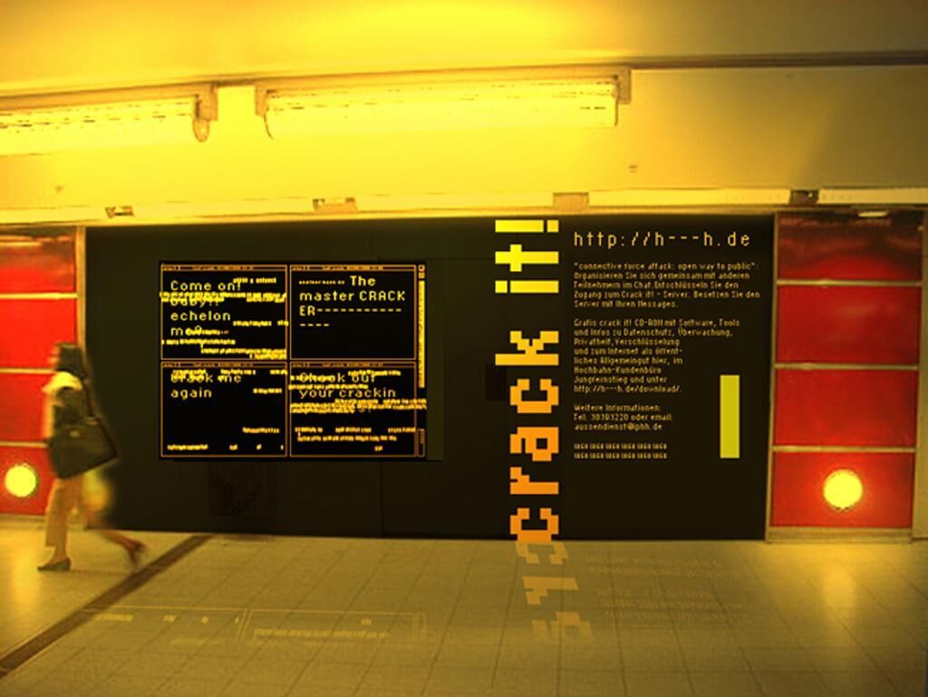 Dreh- und Angelpunkt des Projektes ist die konzertierte Aktion mit anderen Internet-Teilnnehmern, um sich mittels einer Crack-Software (brute force attack) Zugang zu einem Internetserver zu verschaffen. Es gilt in ein Informationsmedium einzudringen und den eigens für diesen Zweck eingerichteten, password-geschützten Internetraum mit eigenen Inhalten zu besetzen. Diese Inhalte werden gleichzeitig an öffentlichen Punkten im Stadtraum Hamburg (U-Bahnstation Jungfernstieg) sichtbar.