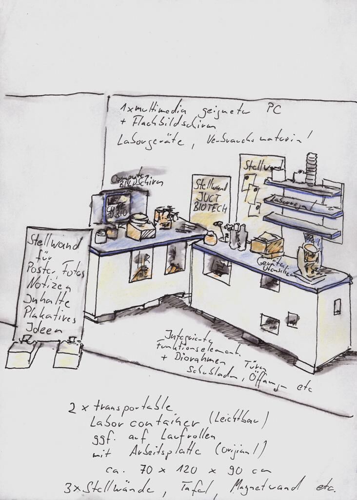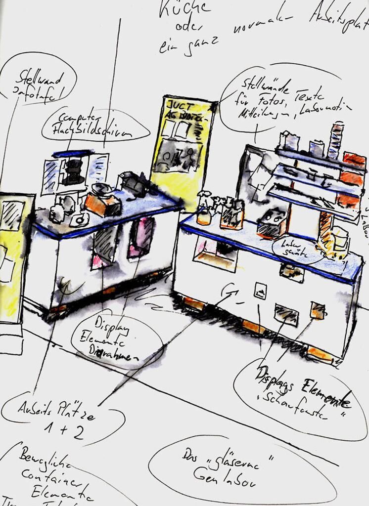 Eine Ausstellung von Dr. Klaus Fritze, Björn Schülke, Dr. Dirk Prüfer, Marcia Vaitsman, Thom Kubli. genlaboratorium.khm.de bezeichnet ein künstlerisch-wissenschaftliches Ausstellungsprojekt. Das Projekt gründet auf einen Förderpreis des Stifterverbandes der deutschen Wissenschaft e.V., der im Januar 2000 die Biologen Dirk Prüfer und Klaus Fritze für ihre Projektskizze mit dem Titel ""Das Gläserne Genlaboratorium. Frankensteins Küche oder ein ganz normaler Arbeitsplatz? "" auszeichnete. Die Initiatoren, Prüfer ist Wissenschaftler des Aachener Fraunhofer Instituts für Umweltchemie und Ökotoxikologie, wo er eine Abteilung ""Angewandte Genomforschung"" leitet, und der ""künstlerische Forscher"" Klaus Fritze haben zur Ausführung ihres Konzepts die Zusammenarbeit mit Absolventen und Studenten der Kunsthochschule für Medien gesucht. Gemeinsam mit Björn Schülke wurde das 1:1 Modell eines typischen Arbeitsplatzes aus einem realen Genlabor in einer mobilen Form nachgebaut. Nachdem die Besucher zuvor Laborkittel mit der Aufschrift ""Biotechnologie"" erhalten haben, erlaubt eine Schleuse den Zugang zur Laborinstallation. Nicht alles soll verraten werden, aber soviel, daß auf einer Arbeitsbench eine audio-visuelle Projektion sichtbar wird, die in fokussierter Form typische Arbeitsprozesse in einem realen Genlabor widerspiegelt. Bereitgestellte molekularbiologische Materialien, Werkzeuge und Apparate dürfen berührt und benutzt werden. Viele Anordnungen wurden höchst realistisch, andere in eher fantastischer Manier gestaltet. Ein Ziel des Ausstellungskonzeptes ist es, durch medial flexibel gehaltene Stilmittel ein haptisch erfahrbares Bild über den sozialen und wissenschaftlichen Arbeitsalltag in Genlaboratorien zu entwickeln. Modifizierte Medienpflanzen, mediale- wie biologische Materialsammlungen, eine Soundinstallation von Thom Kubli und die von Marcia Vaitsman realisierte website www.genlaboratorium.khm.de"" thematisieren in intermedialer Form Algorithmen und Materialität des genetischen Codes als einer gemeinsamen Sprache des Lebens. Irritationen und Fragen zur ubiquitären Präsenz des Genlaboratoriums werden im ""sozialen Raum"" der Ausstellung aufgegriffen und leiten weitere Diskussionen über die sozialen, technologischen, ethischen und ökologischen Implikationen von rekombinanten Biotechnologien ein. Denn genlaboratorium.khm.de bezeichnet nicht nur Arbeits- und Gestaltungsprozesse, sondern ist in der öffentlichen Galerie für eine Woche Thema eines fortlaufenden und offenen Diskussionsprozesses über Gentechnik als eine der umstrittensten Technologien. Das ""Genlaboratorium"" wird nach seiner Premiere in Köln auf Reisen gehen und an zahlreichen weiteren Orten zu besuchen sein.