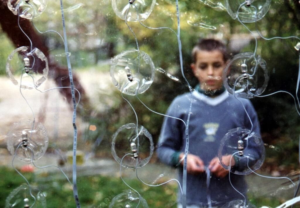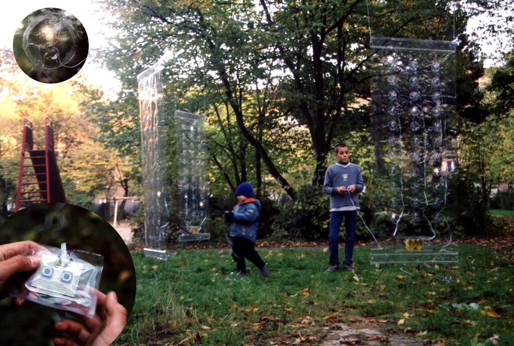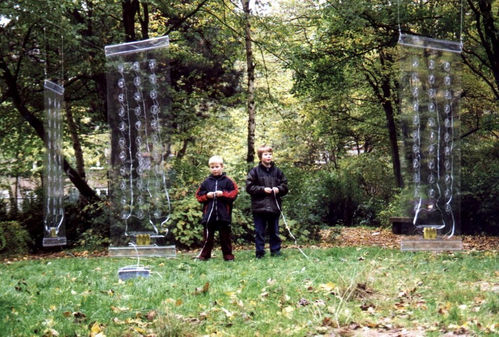 Drei Plastikfolien, die sich als transparente Raumteiler variabel installieren lassen, bilden den Rahmen für drei Computerspiele. Die SpielerIn kann mit der Tastatur den einzigen hellen Lichtpunkt nach rechts und links bewegen. Auf den dreien, in die Folie eingeschweißten, vertikalen Lichterketten bewegen sich nach dem Prinzip eines Lauflichtes schwache Lichtpunkte in immer gleichen Schwingungen auf und ab. Ziel des Spieles ist es, die schwingenden Lichter so geschickt anzusteuern, daß sie den hellen Lichtpunkt ganz nach oben befördern.