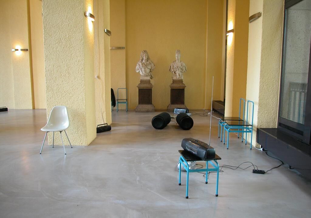 Ein Klangraum wird durch 11 Sender aufgespannt, die dynamisch Schlingen bilden. Dieser ""Schlingenraum"" wird individuell von den Empfänger-Zuhörern ertastet. Aus partialen Wahrnehmungen entsteht eine Öffentlichkeit. Die Zuhörer verknüpfen sich untereinander aktiv und interagieren mit den Sendern. Sender und Empfänger performieren sich wechselseitig. Das Agieren des Einzelnen im öffentlichen Raum ist abhängig von der räumlichen Wahrnehmung und den damit einhergehenden Raumvorstellungen. Eine mögliche Raumkonstitution durch Syntheseleistungen wie Wahrnehmungs-,Vorstellungs- oder Erinnerungsprozesse bedingt eine aktive Verknüpfung durch Menschen (Martina Löw, Raumsoziologie, 2001). Das Radio – verbreitete low-cost Technologie und stellvertretend für ein ständig wachsendes und günstiger werdendes Angebot verschiedenster Kommunikationstechnologien – bietet durch das Prinzip der ""drahtlosen Übertragung"" die Möglichkeit eines potentiellen Empfangs an jeder beliebigen Stelle. Der Empfang ist unabhängig von physikalisch gebundenen Strukturen, wie Kabel oder verlegten Netzwerken, und umgeht die damit verbundene visuelle Verankerung einer euklidischen Raumwahrnehmung. Der akustische Zugang zum räumlichen Verständnis läßt die topologische Grenzziehung zwischen einem Innerhalb und Außerhalb zerfallen. Öffentlicher und privater Raum, sowohl als materielles wie auch als soziales Gebilde, unterliegen keiner klaren Abgrenzung mehr. Vielmehr entsteht eine Überlagerung unterschiedlicher relationaler Raumsituationen, deren Erleben und gleichzeitiges Entstehen sich durch das Mitwirken der Akteure konstituieren. Digital fragmentierte Klänge und Rhythmusschleifen werden mittels eines selbstreflexiven Algorithmus auf 11 Kanälen prozessiert und in klanglichen Gruppen arrangiert. Anhand der jeweils vorhergehenden Prozesse werden in Echzeit fortwährend neue Strukturen generiert. Die Relation der Klänge unter- und zueinander beschreibt eine dynamische Räumlichkeit, die sich in Klangfeldern bewegt. Die Klänge werden durch UKW-Sender unterschiedlicher Frequenzen mit kurzer Reichweite übertragen und erhalten ihre räumliche Anordnung über die Positionierung der Empfänger. Als Empfänger dienen handelsübliche tragbare Radios, Taschenradios, Ghettoblaster. Diese werden in variablen Gruppen im Raum positioniert, können durch verschiedene Räumlichkeiten und den Außenraum verteilt und idealerweise vom Rezipienten bewegt werden. Die gesendete Information verläßt den vorgesehenen, performativen Raum und bewegt sich in einen vermeintlich öffentlichen Raum. Nicht durch das Übertragen einer abgeschlossenen Komposition, sondern durch das Senden von Partialen wird der Raum genutzt, die Aufführung in ihrer Form neu zu strukturieren. Erst der Rezipient als potentieller Träger eines Empfängers verändert die klanglichen Strukturen in ihrer topologischen Anordnung und macht sie von der notwendigen Bildung sozialer Strukturen abhängig. Die klangliche Organisation entspricht einem komplexen System, dessen Konrollstruktur dezentralisiert ist. Die einzelnen Dynamiken der jeweiligen Kanäle verhalten sich derart, daß kleinere Empfängergruppen der Installation in sich funktional sind. Mittels der durch die Rezipienten veränderbaren Anordnung der Empfänger charakterisieren potentielle Umstrukturierungen die räumliche Diskontinuität. Hardware: Macintosh G4 Computer mit 512 MB RAM, Audiokarte mit 16 analogen Ausgängen. Software: Programm Supercollider zur Steuerung, Verwaltung und Generierung der Klänge. 11 selbstgebaute UKW-Radiosender mit variabler Sendefrequenz, als Empfänger dienen handelsübliche Radiogeräte. Die Installation besitzt eine variable Größe.