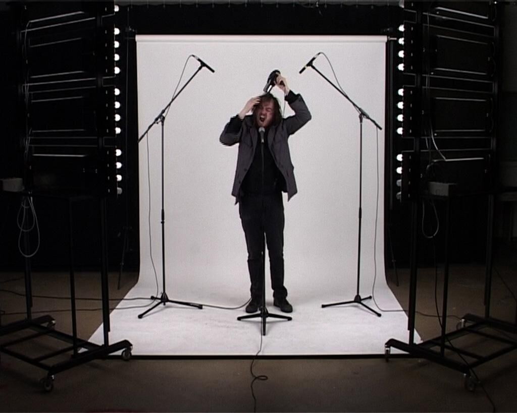 Nach einer Wartezeit betrete ich den Studioaufbau. Dann föhne ich meine Haare und schreie dabei. Danach verlasse ich den Raum, der leer zurückbleibt.