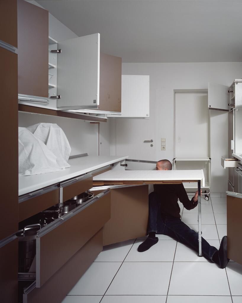 Bei ‘Umposen’ inszenierte ich Personen in Räumen, zu denen sie in ungewöhnlichen körperlichem Ausdruck nehmen. Die Arbeit umfaßt sechs Bilder, in dem je ein Protagonist in der Rolle des Einzelgängers, des Einzelkämpfers agiert. Man findet Kinder im Spiel außer sich, aber erwachsene Menschen treten seltenst aus ihrer konventionellen Form. Die Haltung zu bewahren im sprichwörtlichen Sinne, bezieht sich auch auf die körperliche Kondition, so wird die Haltung für einen kurzen Moment verloren, wenn man plötzlich und unerwartend stolpert, aus seiner Form fällt und sich über das seltsame Gefühl während dessen und kurz danach wundert. Diese Arbeit leitete mich zu ‘solche und jenes’, ein anderes Verhalten, eine andere als die gewohnte körperliche Haltung einzunehmen, die sich auf den Raum bezieht. In meiner Diplomarbeit ist die Handlung nun wichtiger als der Raum, der Raum bietet die Variante, aber ist austauschbare Kosmetik.