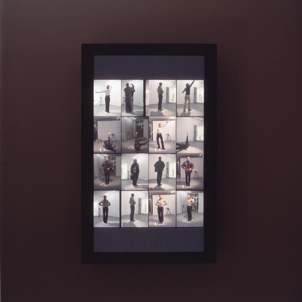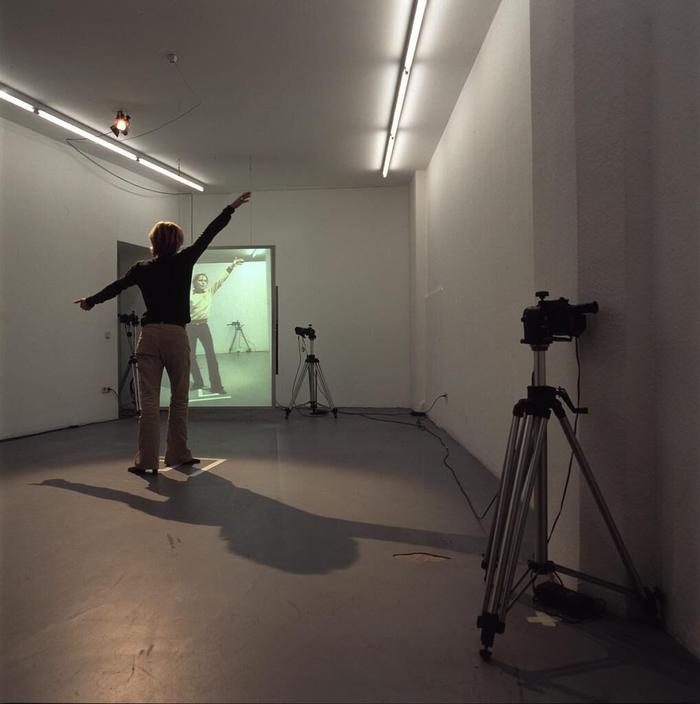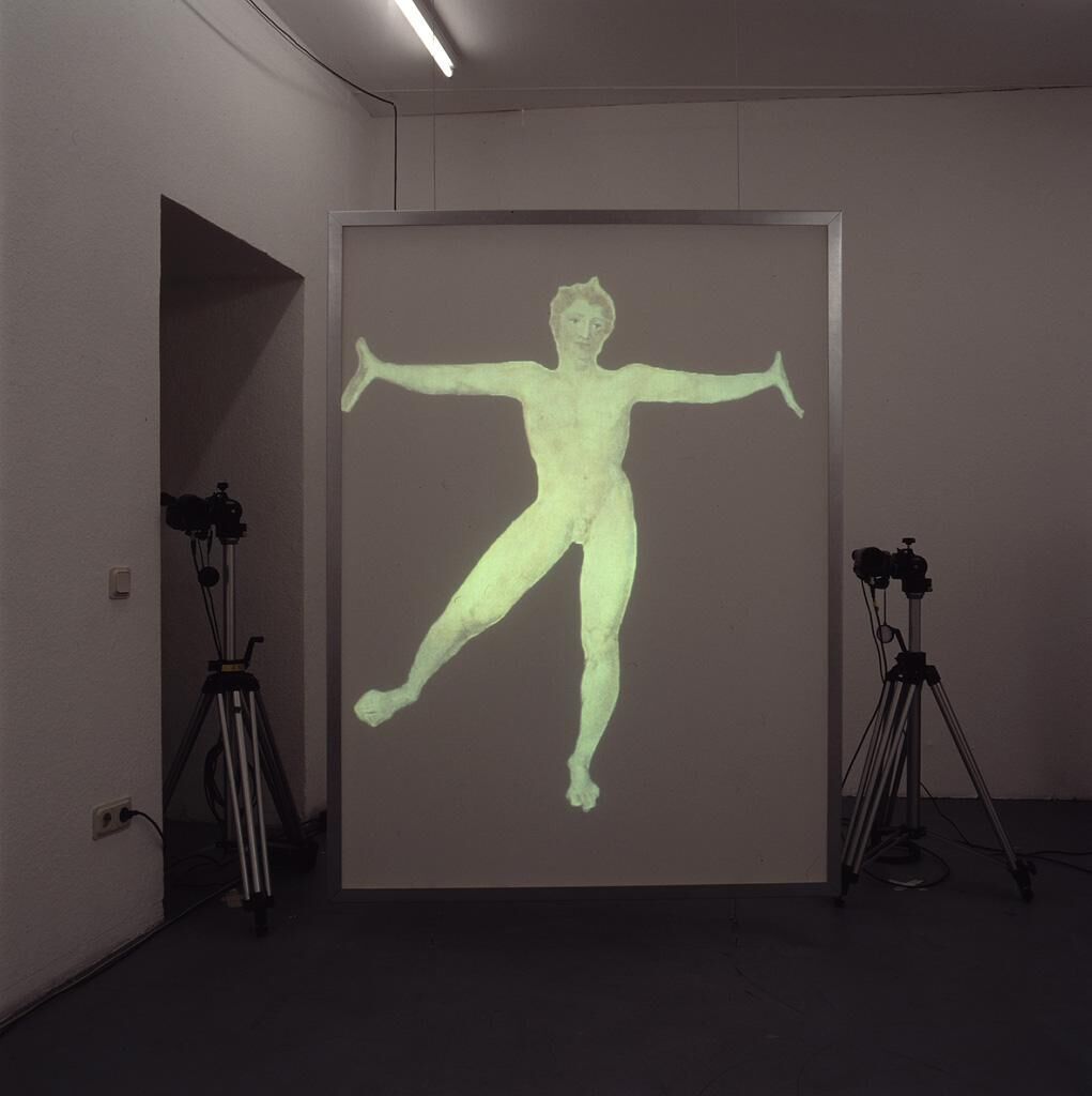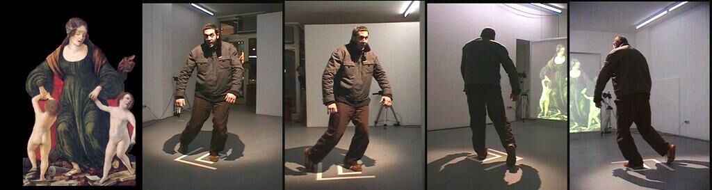 Panopticum : projektion + kamerasystem + imagebanking panopticum ist eine interaktive apparatur: eine körpergroße projektion zeigt muster von gesten, die von den besuchern nachgestellt werden sollen. die nachstellungen werden aufgezeichnet und in der databank aufgenommen.