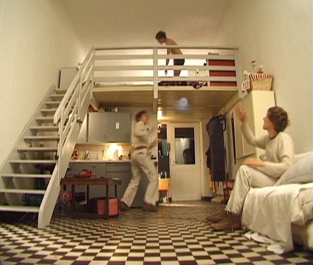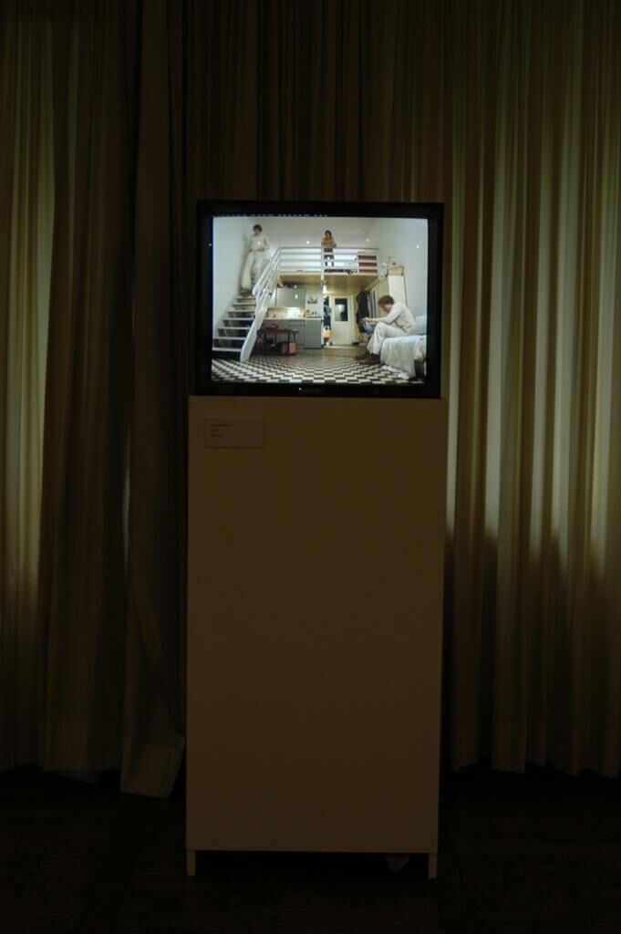 Ein Mann kehrt abends heim in sein Einzimmerappartement. Nimmt sich ein Glas Wasser, setzt sich hin, schnürt sich die Schuhe auf, geht zu seinem Bett, zieht sich aus und legt sich hin. Zur gleichen Zeit steht er auf, in Eile, zieht hastig seine eben erst abgelegte Kleidung an, hastet zur Tür und verschwindet. Die Videoarbeit „Zwirn“ besteht aus einem Bewegungsablauf innerhalb einer festen Einstellung. Dreimal zur gleichen Zeit ist die Aufnahme zu sehen, zeitlich jeweils um einige Sekunden versetzt. Während der Mann sich neben seinem Bett auszieht, steht er hastig auf und kommt zur Tür herein. Er hastet zur Tür, trinkt neben dem Bett ein Schluck Wasser und bindet sich auf dem Sofa die Schuhe auf. Vom Sofa aus wirft er dem Herauseilenden seine Mütze zu. Reicht sich nach dem Hereinkommen ein Glas Wasser ans Bett und lässt vom Bett aus den Herauseilenden das leere Glas wieder zur Spüle zurückbringen. Dreimal ineinander verschachtelt kommuniziert der Bewegungsablauf mit sich selber. Die Linearität des Videos löst sich auf in drei logisch nicht lösbaren Verschachtelungen, einer Parallelität, einem hermetischen Ineinander.