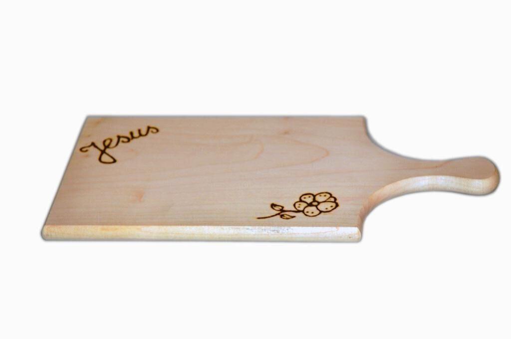 „die heilige familie“ Objekt Frühstücks-Holzbrettchen mit eingebrannter Aufschrift