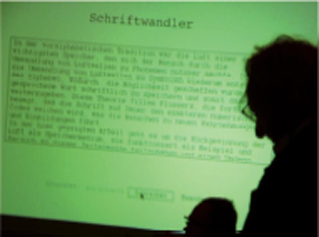 In der voralphabetischen Tradition waren es die Speicher, die sich der Mensch durch die Umwandlung zu Phonemen nutzbar machte. Durch die Umwandlung der Symbole wiederum entstand das Alphabet, wodurch es geschafft wurde, das gesprochene Wort schriftlich somit dauerhaft weiter zu geben. Diese Theorie führt fort, dass die Schrift auf Dauer den Codes weichen wird, was die Menschen zu neuen Einbildungen führten wird. In der Arbeit „Schriftwandler“ geht es um die Rückgewinnung des Speichermediums, sie funktioniert als Beispiel, an der Zeitenwende teilzuhaben, und bietet einen Umgang mit der „Schreibmaschine“, die geschriebene Worte in Phoneme verwandelt und mittels dieser Umwandlung der Luft rezipierbar macht.
