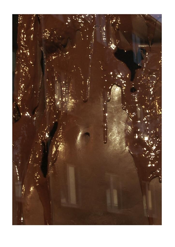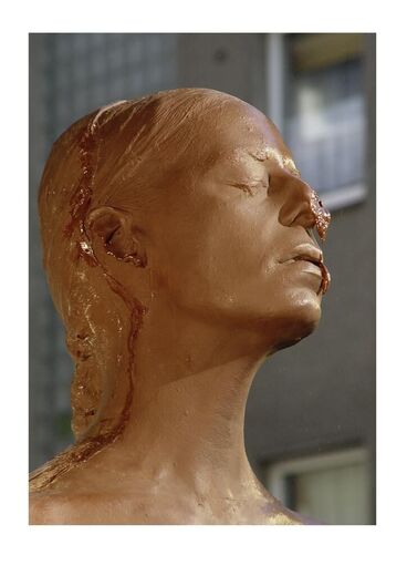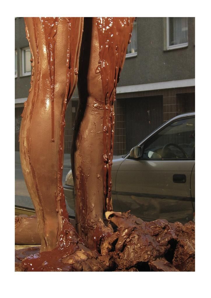 In der Videodokumentation lässt die Künstlerin ihren aus Schokolade angefertigten Ganzkörperabdruck unter starker Wärmebestrahlung restlos dahin schmelzen.