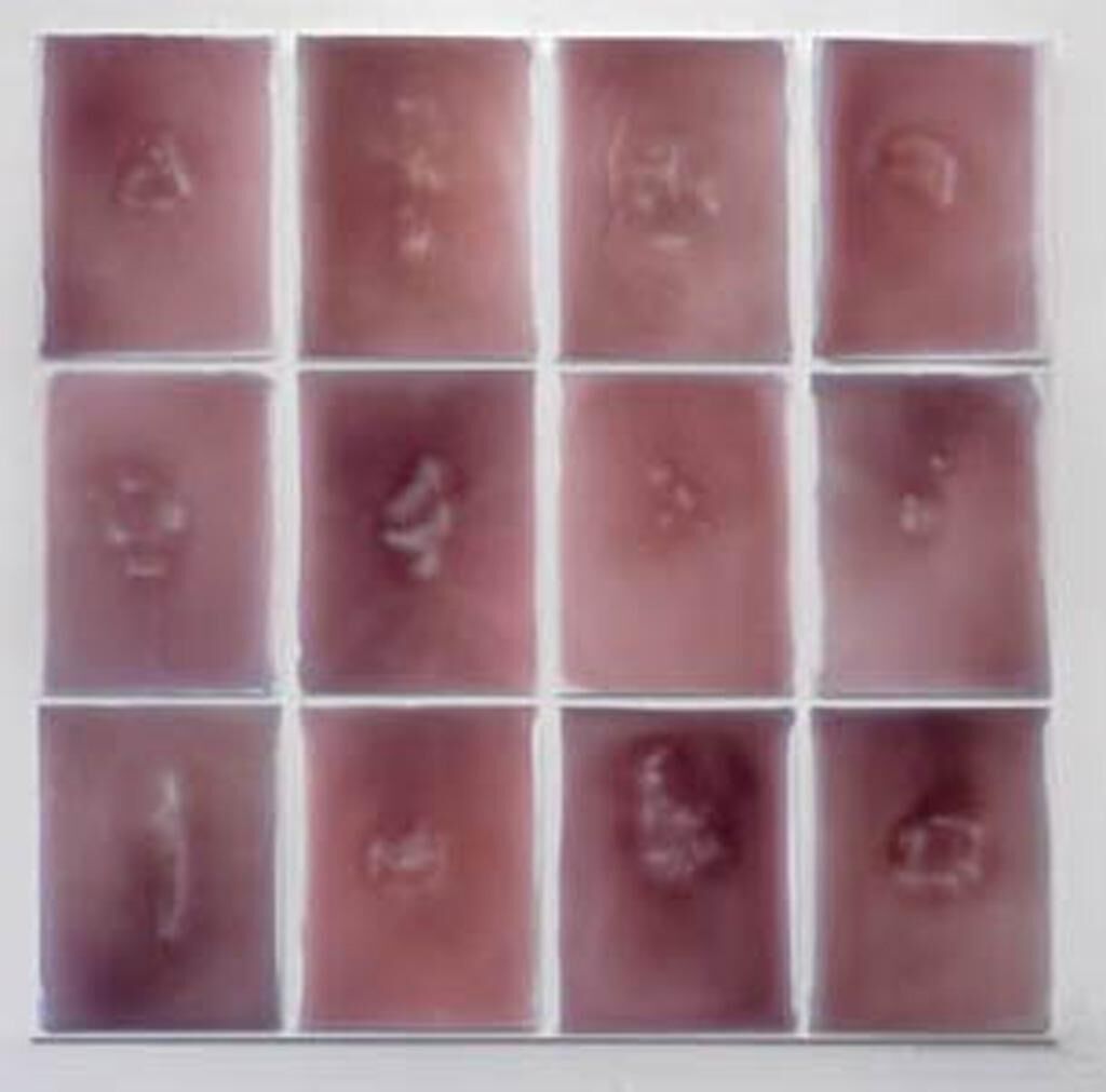 Der Foto-Bildblock setzt sich aus 12 Fotografien von rosafarbenen Wachsplatten zusammen. In den Wachsoberflächen zeichnet sich der Abdruck eines unbekannten Objekts ab. Die zwölf Fotografien der Wachsplatten werden im Verhältnis 4:3 zu einem großen Bildblock gehängt. Die Abdrücke auf den Platten stammen von 12 Bleigewichten, die ich zuvor in Ton abgegossen habe. Die Abdrücke schreiben Spuren ein und hinterlassen irreversible Narben, die sich in der weichen, hautartigen Fläche abzeichnen. Fotografien der 12 einzelnen zu den Wachsplatten korrespondierenden Bleiformen sind auf einer Schautafel geordnet aufgereiht. Eine zweite Schautafel zeigt in der selben Anordnung ausschließlich die schwarzen Umrandungslinien der Bleiformen, die ergänzt sind mit Bezeichnungen (Zerfall, Ordnung, Widerstand, Verlangen) und Gramm-Angaben.