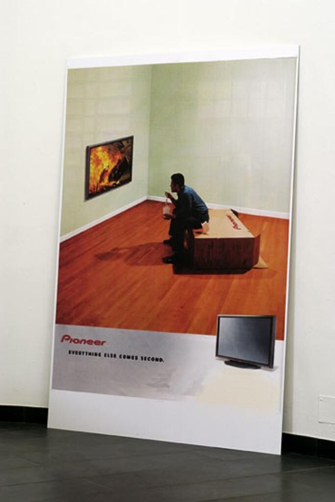Die tradierten Definitionen von Ironie, Wahrheit und Realität sind im neuen Jahrtausend elastisch geworden, weil die Grenzen zwischen Tragödie und Unterhaltung verwischen und solch grundlegende und entgegengesetzte Signifikanten wie diese zu einem einheitlichen Erlebnis von Unglaube und Absurdität verwandelt und manipuliert werden – um Marktstrategien, nationale Slogans, Schlagzeilen, Gewinne und Macht zu produzieren. Inkjet-Print