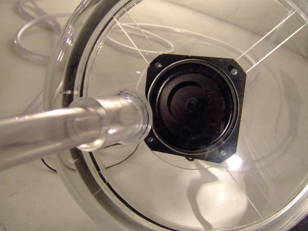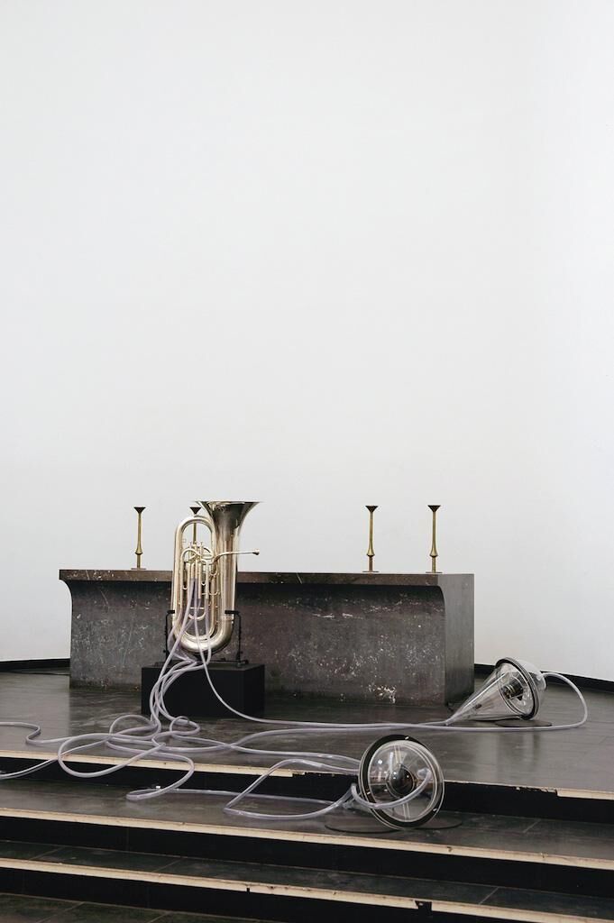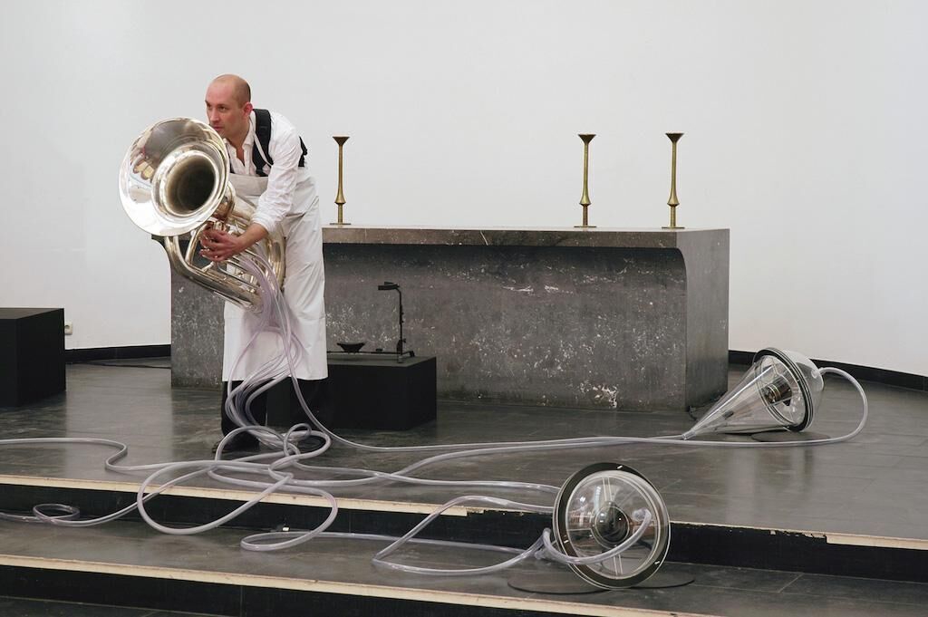 Eine Tuba in einem medizinisch anmutenden Versuch aus Schläuchen und gläsernen Apparaten, Brutkästen zur Generierung neuer Organismen und ein Tubist im Schlachterkittel zur zeremoniellen Befruchtung der Luft. In der Performance und Klanginstallation verbinden transparente Luftschläuche eine klassische Tuba mit drei externen Acrylglastrichtern, in denen Mikrophone und Lautsprecher installiert sind. Die aufgenommen Signale der Tuba werden über einen Computer als Delay zurück an die Lautsprecher gesendet und es entsteht ein elektroakustischer Klang, indem die Rückkopplungen mit den neuen Signalen der Tuba akustisch verschmelzen. Nach Anregung der Apparatur verschließt der Tubist die Schalltrichter, die als akustische Brutkästen, das musikalische Material immer weiter rückkoppeln. Die klanglichen Ausgeburten dieses Prozesses werden vom Tubisten durch drücken der Ventile wieder zurück in die Tuba geleitet, die zum pneumatischen Spielautomaten wird ohne erneutes anblasen des Instruments. Ein Spiel mit der Materialität des Klangs in der Luft. [...] ""The air itself is one vast library"" Charles Babbage: The Ninth Bridgewater Treatise A Fragment [1837/1838]