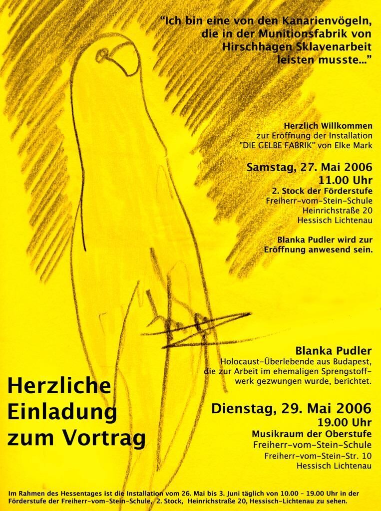 Blanka Pudler ist eine von 1.000 ungarischen jüdischen Mädchen und Frauen, die nach sieben Wochen in Auschwitz zur Zwangsarbeit nach Deutschland in das Lager „Vereinshaus“, einem KZ-Außenkommando von Buchenwald, in Hessisch Lichtenau gebracht wurden. Acht Monate arbeitete sie in der Sprengstoffherstellung im Munitionswerk Hirschhagen. Anlässlich des Hessentages 2006 in Hessisch Lichtenau lud ich Blanka Pudler zu einer Veranstaltungsreihe ein und ergänzte die ""Gelbe Fabrik""-Installation um zwei 500-Seiten starke Bücher, wo jede/r eingeladen wurde, stellvertretend einen der 1.000 Namen der ehemaligen Häftlinge auszustanzen.