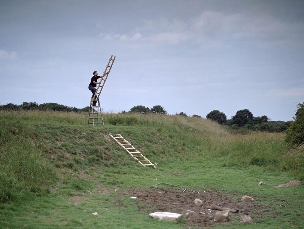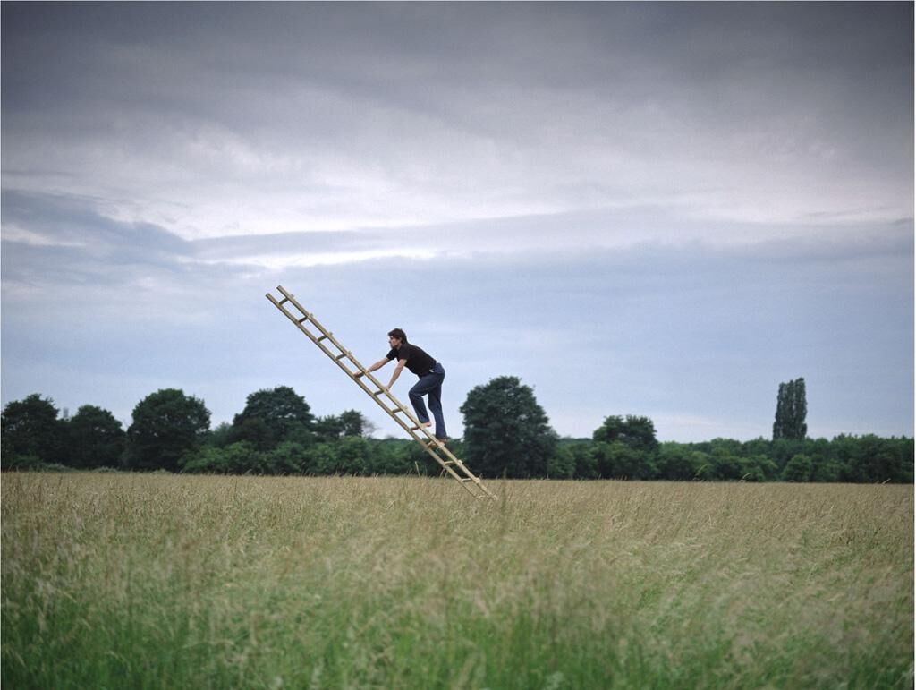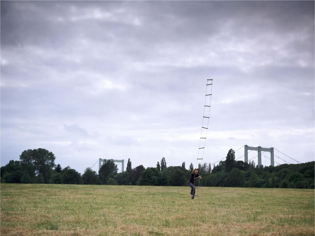 Als Selbstporträt inszeniert, begebe ich mich auf diverse wacklige Leiterkonstruktionen. Das Serielle der Arbeit soll dem menschlichen Drang nachgehen, der immer höher strebt, ohne an den Fall zu denken. So werden auch meine Leitermodelle höher und mein Vorhaben mit jedem Schritt und jedem Bild utopischer.