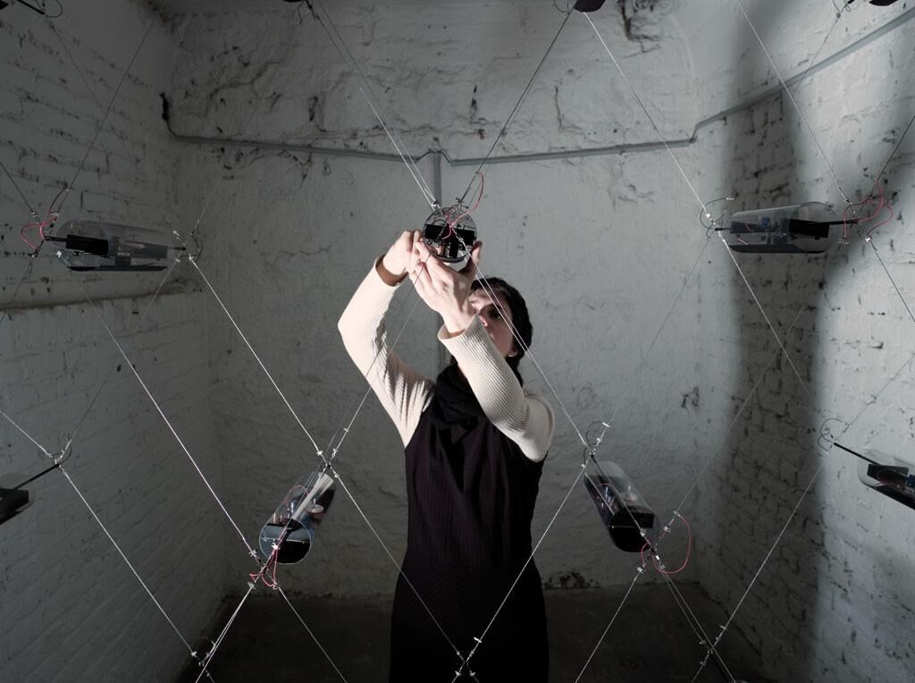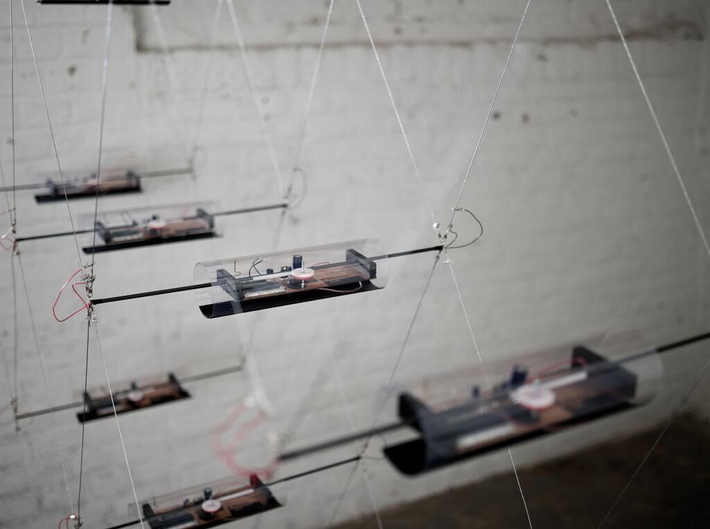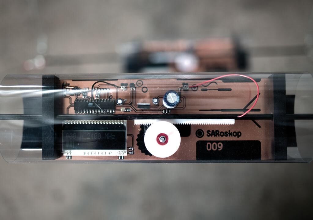 SARoskop ist eine kinetische Raumskulptur, die elektromagnetische Wellen visualisiert. In einer jeweils raumspezifischen Installation registriert die Arbeit elektromagnetische Felder in ihrer unmittelbaren Umgebung und setzt diese in Bewegung und wechselseitige Schwingungen um. Die Arbeit formt eine aus modularen Einzelkomponenten bestehende Matrix, die raumgreifend über dünne, stromleitende Stahlseile von der Decke gehangen wird. Zwischen fünf und fünfundzwanzig Einzelmodule bilden ein Netz, das innerhalb eines ausgewählten Frequenzspektrums die Intensität elektromagnetischer Wellen misst. Die gewonnenen Daten definieren die motorgetriebenen Bewegungen der jeweiligen Einzelmodule, die sich in der Netzkonstruktion potenziert, rückkoppelt und fortbewegt. Im Zusammenspiel der Netzbewegung, Geräuschentwicklung und Informationsdisplays im Kern der Module entsteht ein Gesamtbild organischer Autonomie und ästhetischer Eigenständigkeit. Zusätzlich zu permanent vorhandenen elektromagnetischen Feldern kann der Betrachter mittels Handy mit der Skulptur interagieren, beispielsweise durch ein Telefonat die Messung und Bewegungsumsetzung sichtbar beeinflussen. In der Faszination der Rückkopplung reflektiert sich so der ansonsten mittlerweile selbstverständliche Umgang mit elektronischen Alltagsgegenständen wie Mobilfunkgeräten. Die Sichtbarmachung von Funktion und Datentransfer ist hierbei nicht wertend, sie steigert die Intensität der Erfahrung der Arbeit, die so nicht nur in ästhetisierender Form Wellenspektren, sondern einen lebendigen Kommunikationsprozess illustriert.