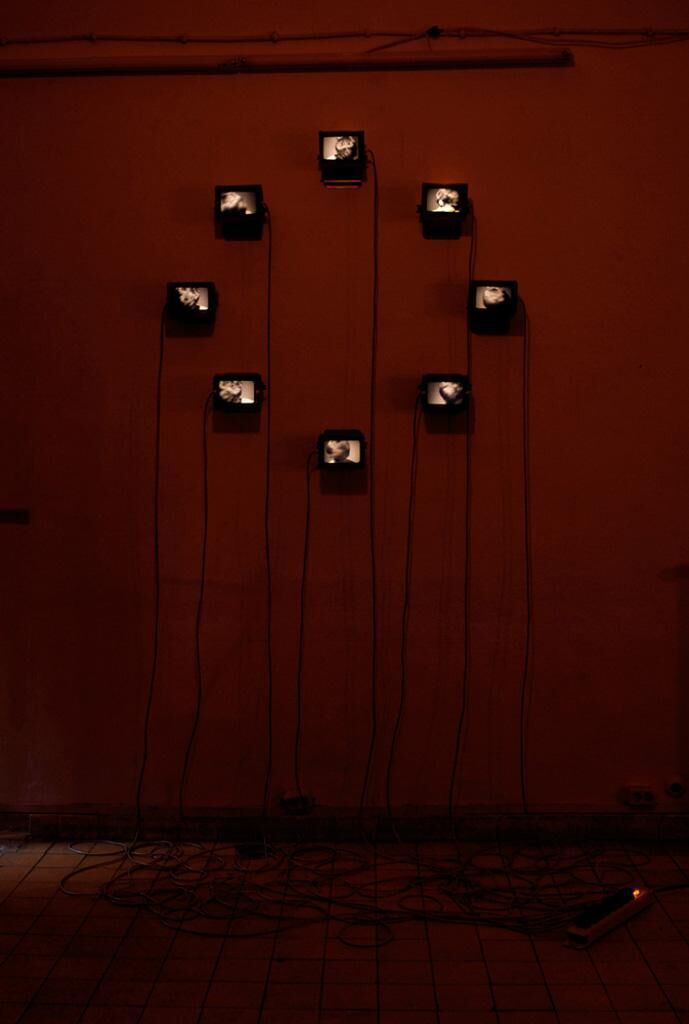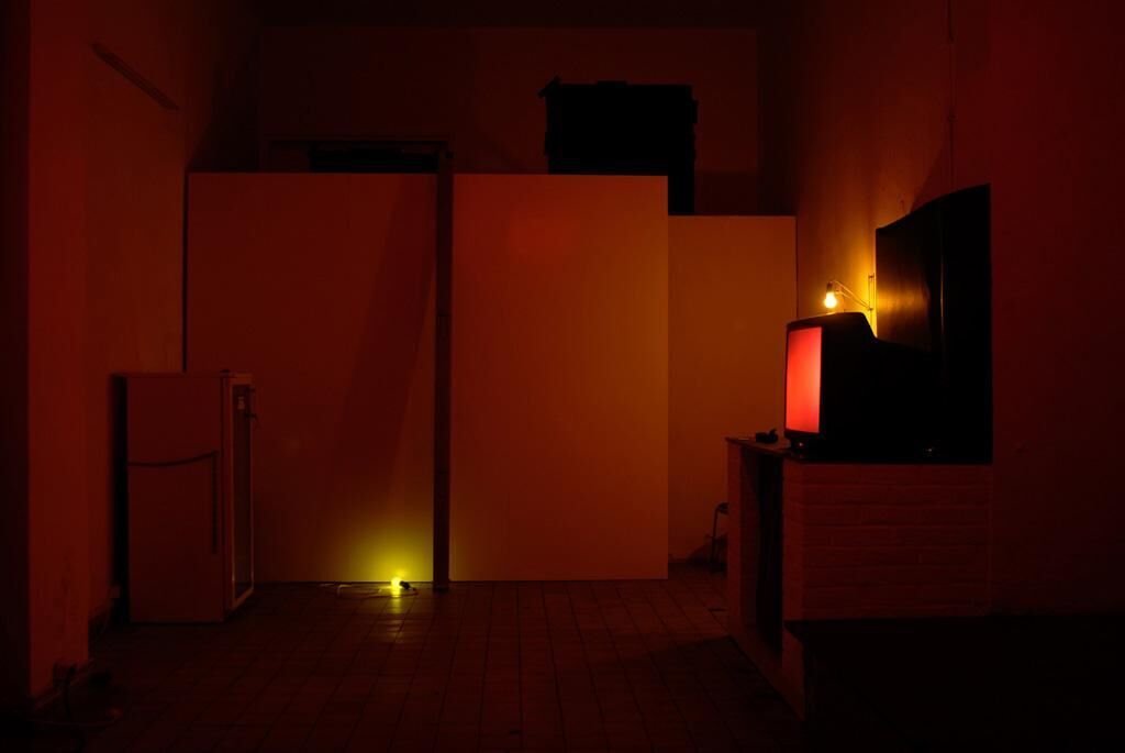 01-05.02.2007, Raum für Kunst und Musik, Köln Wer Nostalgie findet, darf sie behalten. Die dunkle Kammer will nicht leicht gefunden werden. Man sucht sie da, wo sich die alten Leidenschaften entwickeln, das Negativ noch vom Staub befreit, die Zange aus der Schale gefischt und der Abzug zum Trocknen auf die Leine gehängt wird. Wer nach Nostalgie sucht, wird sie hier vielleicht nicht finden, das Erlebnis schon eher. Installierte Arbeiten: ""Die Sehnsucht nach der Rückkehr zum Anfang"" (umgebaute Dunkelkammerlampen, Duratransabzüge, Elektronik) Maße variabel, 2007 'Rotes Bermuda' Videoarbeit, 6min, DV, 2007