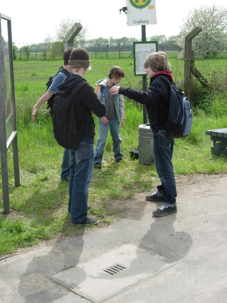 Eine Frau steht wartend an einer verlassenen Bushaltestelle. Fünf Jungs kommen als Gruppe hinzu und schlagen auf ein Plakat ein. Darauf ist eine leicht bekleidete Frau abgebildet. Der kleinste Junge der Gang erkennt, dass sich die wartende Dame an der Haltestelle auf dem Plakat befindet. Es entsteht ein Moment der Verwirrung und Verunsicherung.