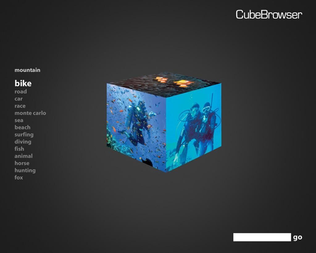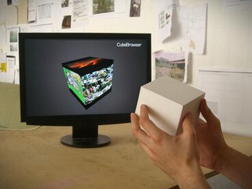 Ein kognitiver Adapter zur Erforschung von Medienarchiven CubeBrowser ist die Designstudie für einen sechsseitigen Bildschirmwürfel, mit dessen Hilfe online durch öffentliche Fotoarchive wie Flickr.com navigiert werden kann. Die Kontrolle wird dabei ausschließlich durch das manuelle Agieren mit dem Würfel realisiert, der es ermöglicht, auf spielerische Weise anhand von Tags vernetzte Bildersammlungen zu erforschen. Bevor die digitale Fotografie aufkam, waren Aufnahmen immer an echte Objekte - nämlich das Fotopapier - gebunden. Man war beim Erforschen seiner Fotosammlungen nicht wie heute auf einen Monitor angewiesen, sondern konnte seine Fotos anfassen, auf dem Boden ausbreiten und kinderleicht mit Freunden teilen. Dieses Projekt wurde von einer alternativen Denkweise über Interaktion inspiriert, die jenseits der Schranken von heutiger Technologie und Gewohnheiten liegt. Dennoch ist eine Realisation als Produkt denkbar. Zwei funktionsfähige Prototypen wurden im Rahmen dieser Arbeit entwickelt, um die neuartige Art des “Datenstöberns” und der physikalischen Interaktion bereits heute Realität werden zu lassen. Der erste Prototyp steuert einen projizierten 3D-Kubus und erzeugt somit eine öffentliche Sichtbarkeit, während die zweite Version den Traum des greifbaren Bildschirmwürfels Wirklichkeit werden lässt.