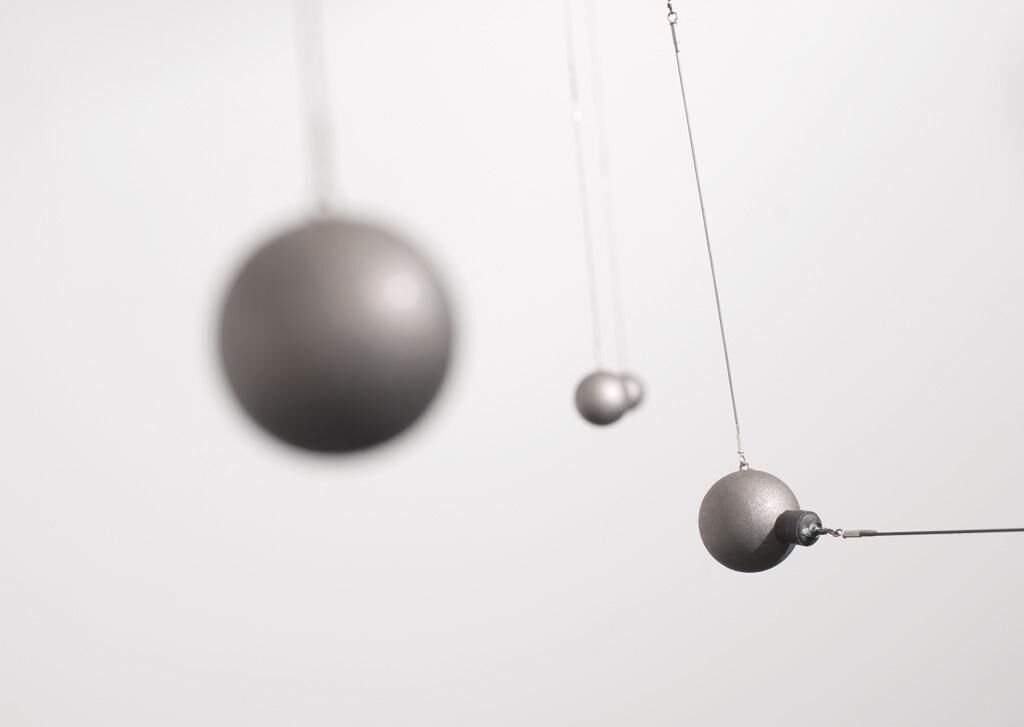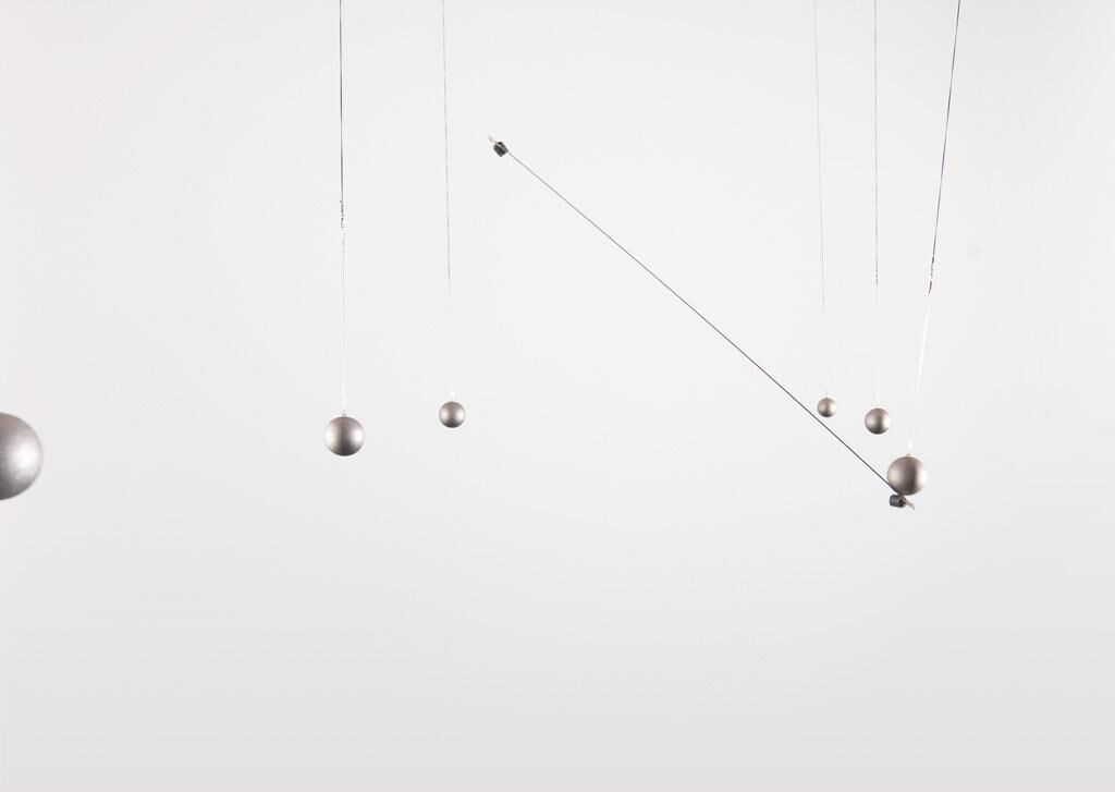 Dreizehn schwingende Kugeln sind an Gummischnüren in einer Matrix angebracht. Ein Stab mit jeweils einem Magneten an jedem Ende steuert das Verhalten der einzelnen Elemente zueinander. Ist eine Kugel mit dem Stab verbunden, regt sie ihre eigene Schwingung solange über einen Motor an, bis sich der Stab löst und mit einem anderen Element verbindet – ein kontinuierlicher Prozess der Paarbildung und Trennung entsteht. Jedes Element besitzt sein eigenes Programm zur Steuerung und Regelung – es existiert kein Hauptprogramm, welches das System von außen steuert. Die Skulptur als analoges System bildet somit fortlaufend sich ändernde Bewegungsmuster und Strukturen. Anknüpfen und Loslösen der Kugeln als Charakteristika dieses Modus sind gleichzeitig Metaphern für das Entstehen von Verbindungen zwischen Elementen, die Kontakt aufbauen und auch wieder verlieren.