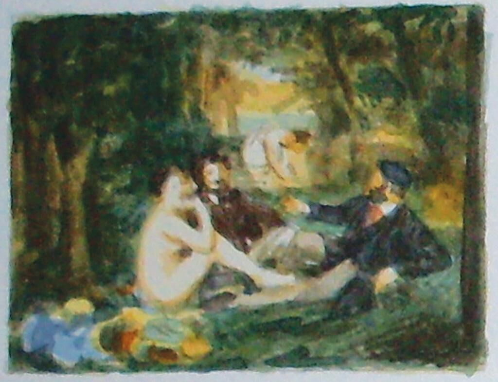 Es gibt einen Fluss, ein Boot, eine Landkarte, ein paar Bäume, zwei Frauen, zwei Männer und einen Picknickkorb. Der Picknickkorb ist mit den zwei Männern und der Landkarte in einem Boot auf dem Fluss auf dem Weg zu den zwei Frauen unter den Bäumen am Fluss. Folglich besuchen zwei Männer zwei Frauen und es besteht die Möglichkeit eines Picknicks. Das Tableau Vivant beschäftigt sich mit der Entstehung und dem Schicksal des Bildes „Das Frühstück im Grünen“ von Edouard Manet, auf welchem zwei bekleidete Männer einer nackten Frau beim Picknick gegenübersitzen. Dieses außergewöhnliche Gemälde, welches 1863 erstmals öffentlich gezeigt wurde, erregte in der Kunstwelt enormes Aufsehen - das Publikum war entsetzt. Dabei war alles mit an Sicherheit grenzender Wahrscheinlichkeit nur ein Missverständnis.