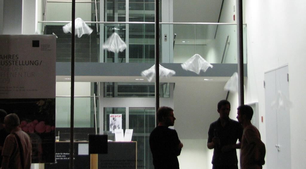 Eine interaktive Installation, in der sich kleine Fallschirme in der Luft auf- und abbewegen, wie Quallen im Wasser. Die Fallschirme entfernen sich, sobald sich Personen nähern. Die Installation lässt den Zuschauer Luft, Raum und Zeit spüren. Dies in unsichtbarer Art und Weise. Zehn Fallschirme werden entlang einer Linie, jeweils an einer Angelschnur hängend, installiert. Ein Schritt-Motor mit einer angebrachten Rolle bewegt die Fallschirme nach oben oder unten. In jedem Fallschirm ist ein Sensor installiert um die Annäherung einer Person zu erkennen. Die Bewegung der Fallschirme imitiert die Bewegung der Quallen aber unter Verwendung des Mediums Luft. Durch die Fallschirm-Bewegungen nach oben und unten tritt Luft ein und aus und es wogt wie unter Wasser.