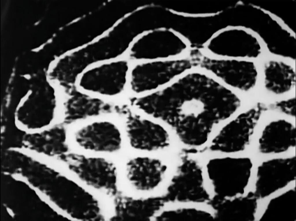 Description: When this film is projected, a portion of each image is reproduced as optical sound. The film is a composition, an arrangement, but not one that is strictly from visual to aural, or the other way around, but for both of these senses at the same time. If you were to cross the nerves of the eye and the ear with one another, the eye would hear lightning as a loud crashing boom and the ear would see thunder as a bright flash of light in the darkness. Statement: Ernst Florens Friedrich Chladni drew a violin bow across the edge of a piece of metal whose surface was lightly covered with sand and visually demonstrated modes of vibration. A Super16mm film camera records images on the area of the film normally allocated to the soundtrack. If a Super16mm film is played in a regular 16mm projector, the images just off-screen to the right are reproduced as sounds, also demonstrating modes of vibration, but in an inverted scheme.