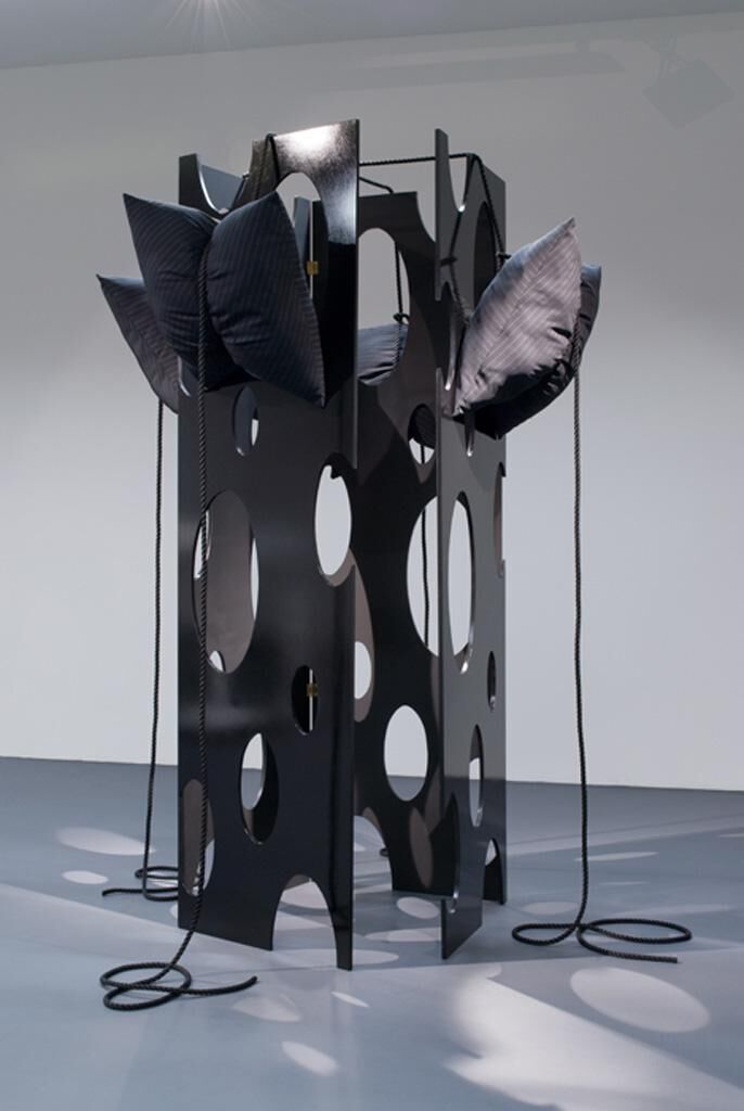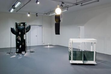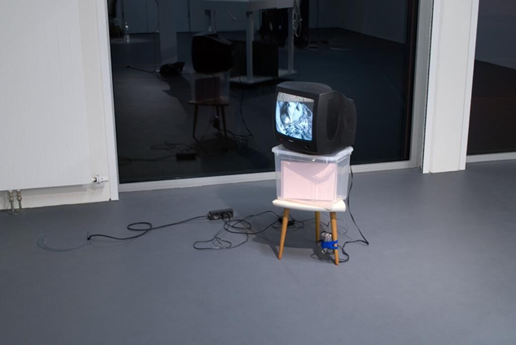 Die Ausstellung zeigt folgende sechs Installationen: 1. ""ohne Titel"", 2009 Mdf, rope, pillow 200 x 100 x 100 cm 2. ""Boden gucken"", 2009 spot, measuring cup, wood, glass plate 35 x 50 x 40 cm 3. ""Horizont"", 2009 lamp, copying paper, cable 45 x 21 x 10 cm 4. ""Copyshop"", 2009 Mdf, rope, copying paper 174 x 50 x 110 cm 5. ""Schulversion"", 2009 Mdf, rope, blackboard paint, crayon 110 x 130 x 90 cm 6. ""Monument Loop"", 2009 monitor, camera, chair, photo, plastic box 40 x 90 x 40 cm (Bilder in Reihenfolge)